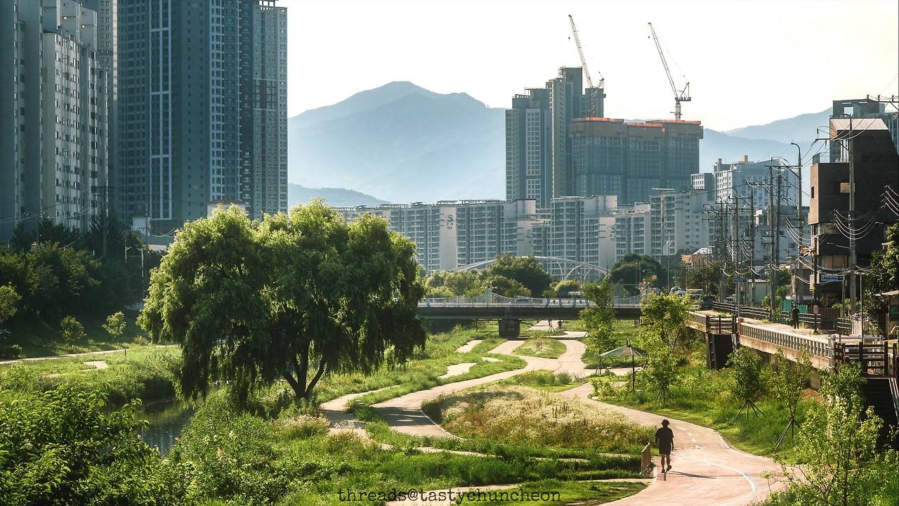 남춘천교 위에서 공지천을 향해 렌즈를 들이댔다. 오후 5시 29분. 하루의 절반이 한참을 지나간 시간임에도 햇살은 여전히 집요했다. 계절은 여름이라기보다, 열기 그 자체였다. 평소라면 사람들로 북적일 공지천 산책로. 그러나 오늘의 길 위에는 그 흔한 발소리조차 드물었다.