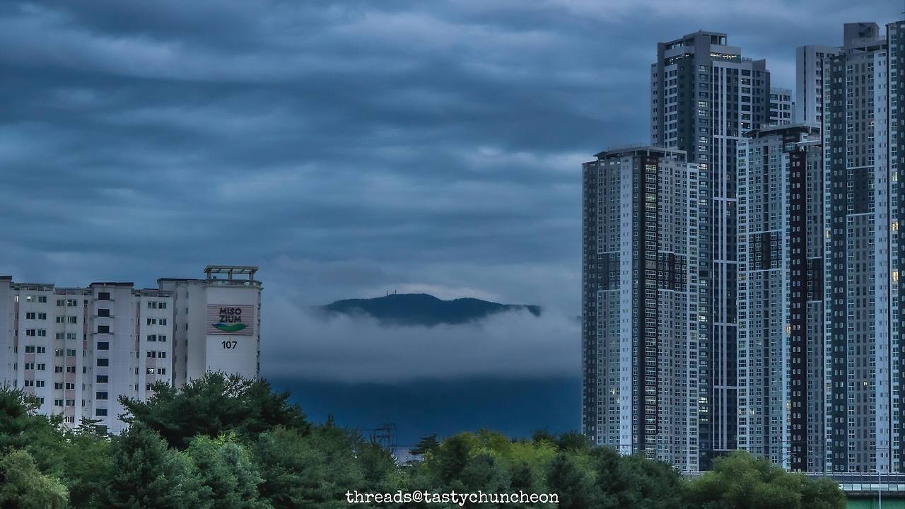 일기예보엔 21시부터 비가 잡혀 있었다. 19시 37분, 이미 공기는 충분히 젖어 있었다. 바람은 습기를 머금은 채 살갗을 스치고, 하늘은 무거운 푸름을 드리운 채 조용히 내려앉아 있었다. 왼편으로는 오래된 신성근화미소지움 아파트, 오른편으로는 높고 날카로운 온의롯데캐슬. 건물 사이로 겹겹이 흐르는 구름은 마치 숨죽인 강물처럼 산허리를 감싸 안고 있었다.