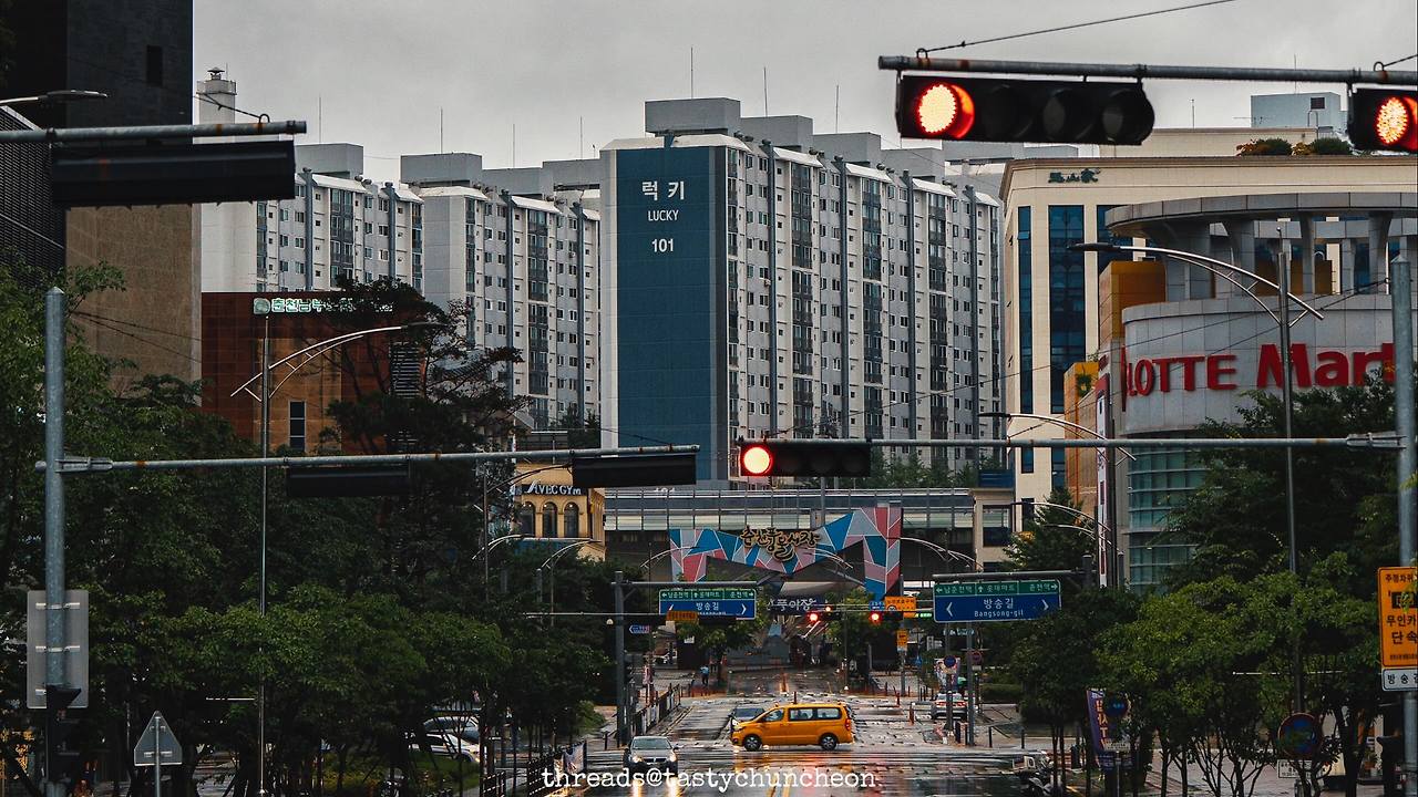 카메라 렌즈에 빗방울이 튀지 않도록 우산대를 겨드랑이에 끼고 온의교 끄트머리에 섰다. 정면엔 1993년 준공되어 올해로 33년차를 맞는 럭키아파트가 담담히 서 있고, 오른편엔 2008년 크리스마스이브에 철거된 춘천 종합운동장 자리에 2010년에 들어선 롯데마트의 둥근 외벽이 묵직한 존재감을 드러낸다.