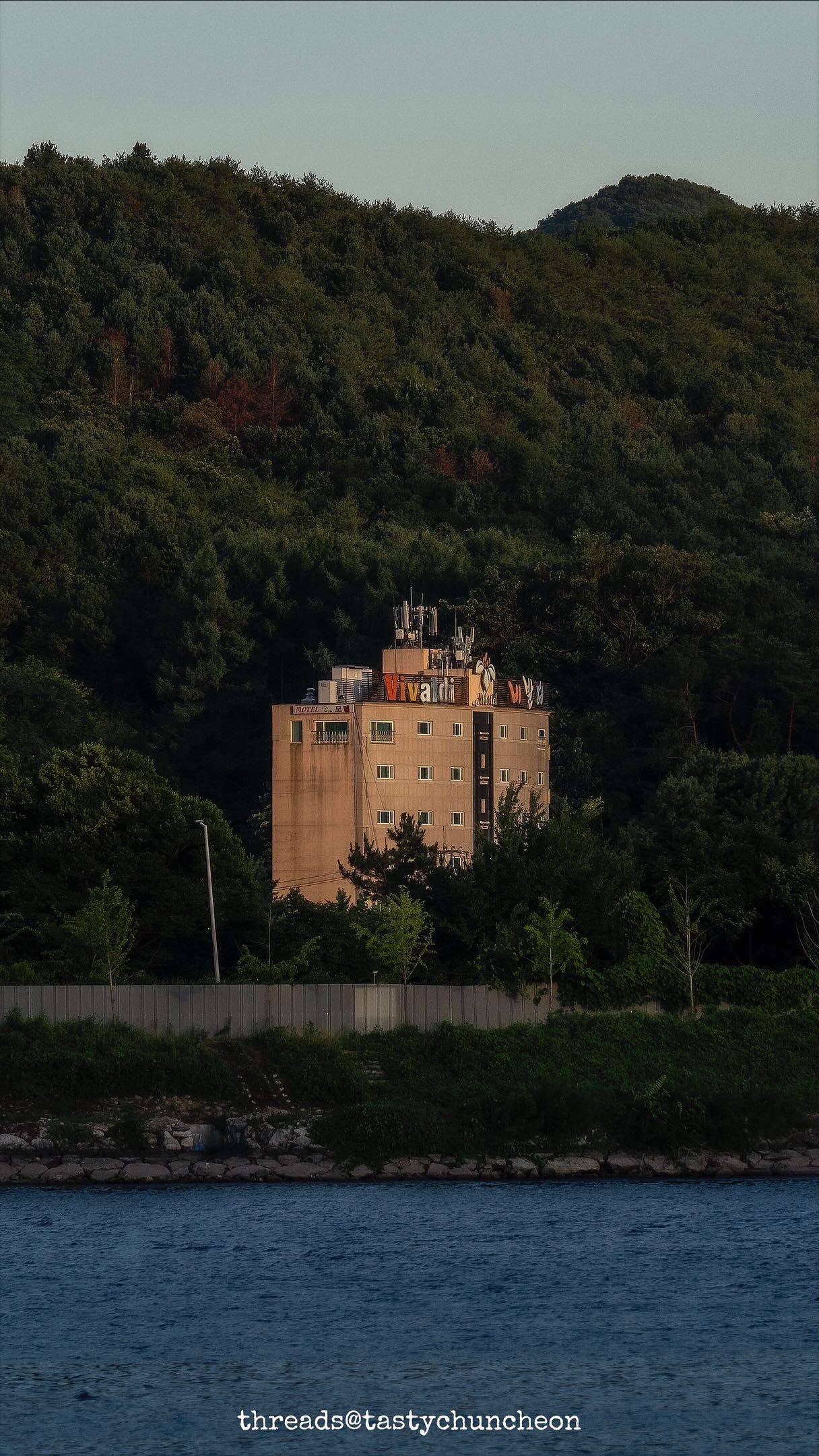 건물 외벽에 쓰여 있는 Vivaldi라는 이름은 마치 나 여기 있어! 하고 손을 흔드는 듯 선명했다. 건물의 벽면은 세월의 흔적이 녹슨 듯 무심하다. 벽면에 모텔이라는 간판이 소심하게 덧붙어 있는데, 그 간극이 묘하게 웃기다. 의암호가 출렁이고, 산등성이가 감싸 안은 천연 요새 한가운데. 누가 봐도 이곳은 고즈넉한 별장 분위기인데, 모텔이었다니.