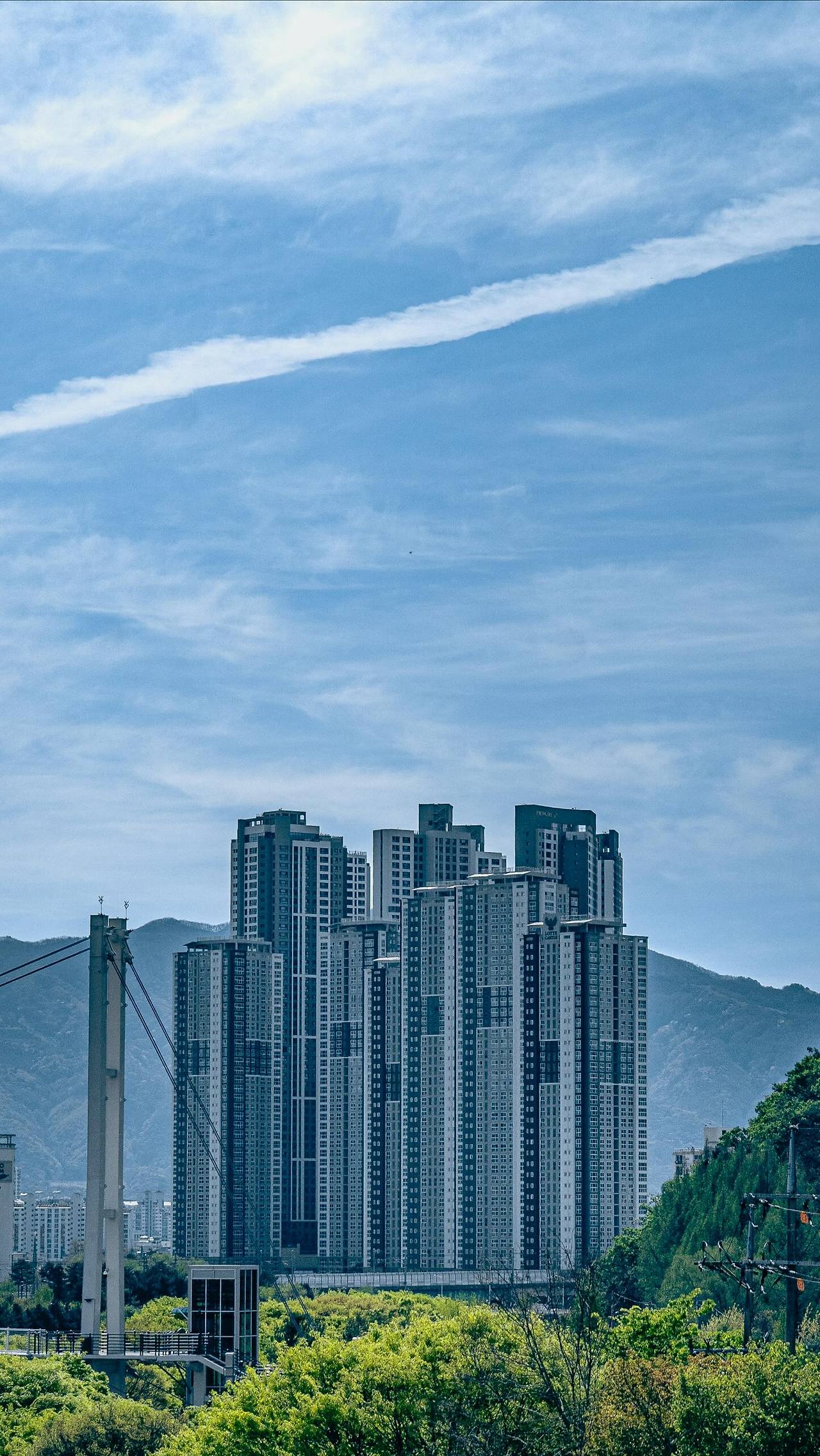 자연과 도시가 절묘하게 겹쳐지는 풍경. 도시의 성처럼 솟은 높은 아파트와 푸른 산등성이, 그리고 하늘에 길게 나 있는 구름 한 줄기. 마치 손가락으로 조용히 그어놓은 쉼표 같기도 하고, 바람이 지나간 자취같기도 하다. 힐링이 뭐 별거겠어. 누군가에겐 고요한 호숫가일 수도 있고, 또 다른 누군가에겐 초록이 짙어진 이 풍경일 수도 있다.