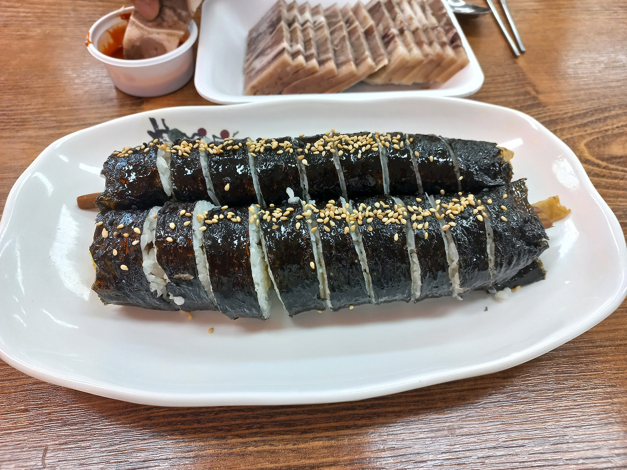 김밥은 밥에 양념을 하지 않아 보였고, 속 재료로 밥의 비어있는 맛을 채웠다. 그리고 질 좋은(구수한) 참기름을 충분히 바른 후 깨를 듬뿍 뿌려냈다. 무엇보다도 꼬다리의 크기가 압도적이었다.