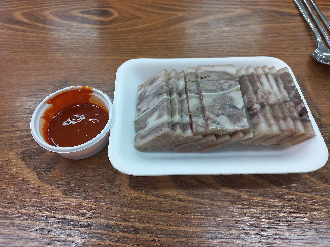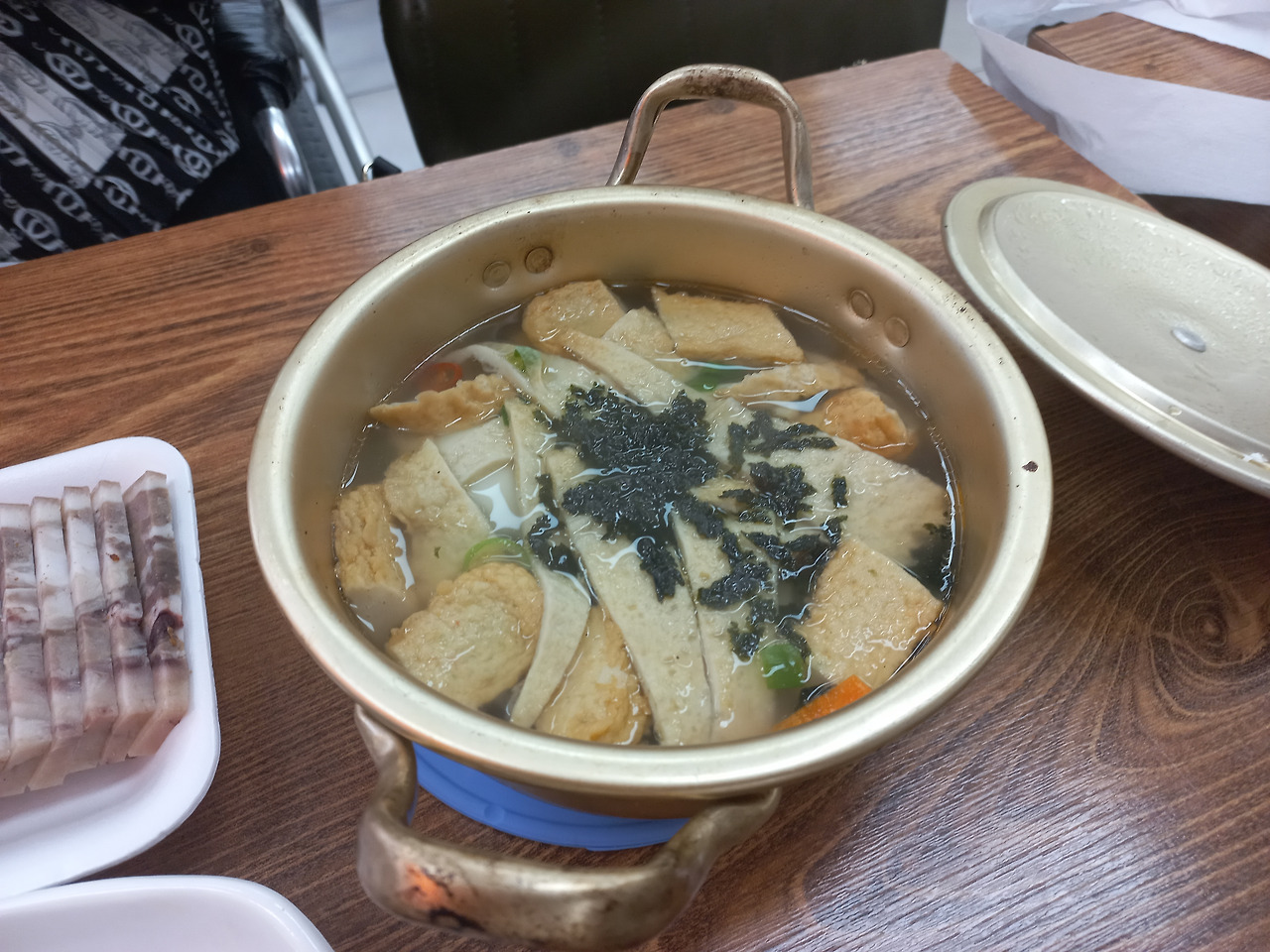 김밥과 즉석오뎅이 나오기 전에 머릿고기 편육의 포장을 뜯었다. 살코기 비율이 높은 편육이었고 잡내 없이 담백했다. 대게의 머릿고기 편육은 껍데기가 주는 쫀득함과 비계가 주는 고소함이 조화를 이뤄 맛을 내는데 말이다.