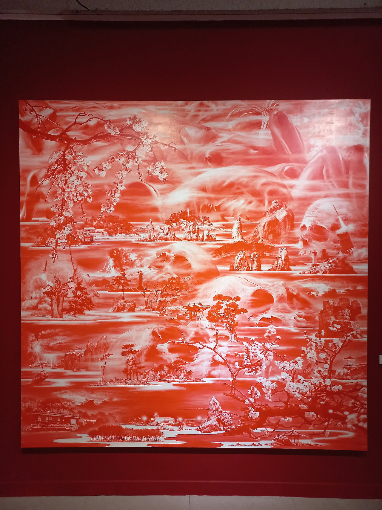 온통 빨간색인 산수화. 크기가 압도를 선사하는 산수화. 해골이 등장하고 GOP 초소가 보이고 미사일이 발사되고 작가의 페르소나와 시공간을 넘나들며 다양한 인물을 등장시킨 산수화. 물리성과 소재만으로도 차별에 성공했는데 이에 더해 전통 산수화를 뿌리 삼아 관객의 고정관념을 영리하게 이용한 산수화 혹은 풍경화. 이세현 작가의 작품을 거칠게 표현하자면 그러할 것이다.