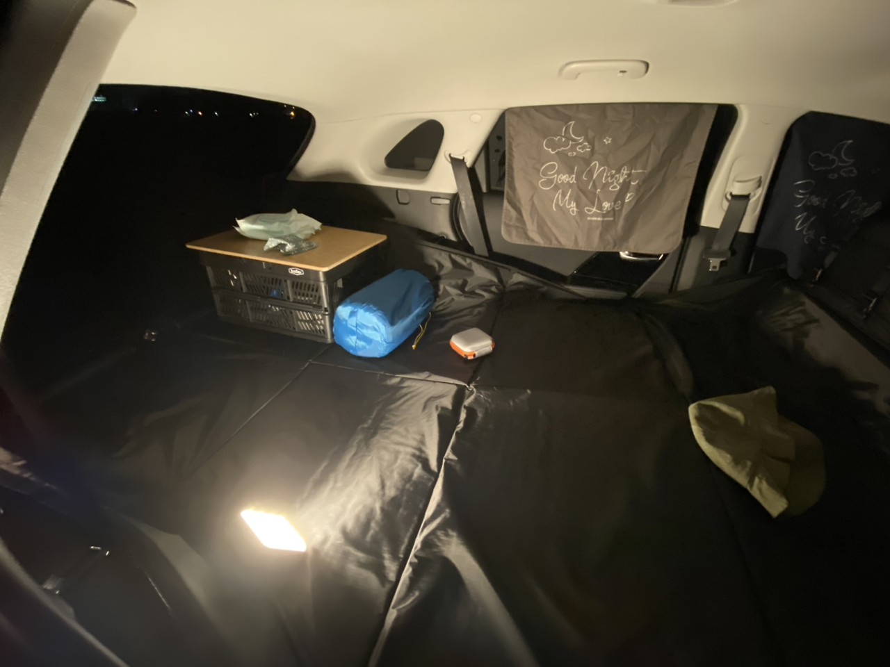 자전거를 타면서 그리고 동네 주변을 걸으면서 차를 대놓고 잠들어도 될만한 곳을 눈여겨봐 뒀다. 그리고 알마전에 운동삼아 걸으러 나왔다가 어디에 차를 대면 좋을지를 살펴봤다. 오늘은 텐트 바닥에 까는 매트, 차량용 놀이매트, 바닥에 쓸 침낭, 이불이 되어줄 동계용 침낭을 챙겼다. 캠핑 다니며 쓰는 접이식 플라스틱 상자에는 생수, 쓰레기봉투, 물티슈, 간식을 챙겨 나왔다. 세팅을 하고 간식을 먹고 이렇게 글을 쓴다.