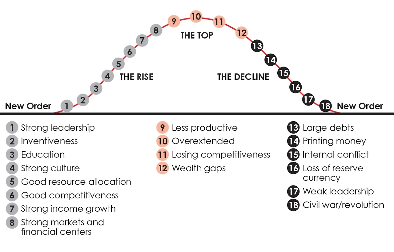 모든 사이클의 기반은 생산성입니다. 생산성이 좋으면 돈을 벌고 강해지고 기축통화가 됩니다. 생산성이 상대적으로 떨어지면 기축통화는 경화에서 멀어지고, 점점 fiat가 되어가다가 내전, 전쟁, 자연재해 등의 사건이 계기가 되어 경제가 파탄나고 쇠락하게 됩니다.