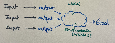 즉 목표는 수많은 수행결과의 집합이고 내가 관할하지 못하는 요소의 혼합된 결과물입니다. 외부요소는 주로 운(luck)과 환경적 동역학(environmental dynamics)입니다. 동역학은 타인, 타사, 규제 등 내 행동으로 인해 변화되지만 사전적으로는 예측이 어려운 요인입니다.