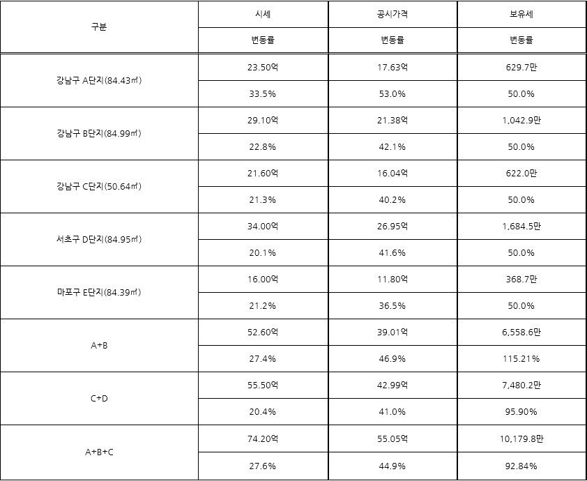 국토교통부 발표자료에 따르면 강남구나 마포구 등 고가주택 밀집지역은 20~30% 이상으로 상승하는 경우도 있을 수 있으며, 보유세(재산세+종부세)는 50%이상 상승할 것이라 한다.