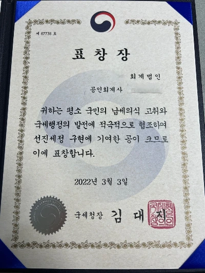 2019년부터 2022년, 총 4년간의 국선대리인 활동이 마무리되는 시점에 사건을 배정해 주던 세무공무원 분에게 연락이 와서 그동안 열심히 활동을 해줘서 고맙다고 표창장 후보자로 올렸다는 이야기를 해주었다.