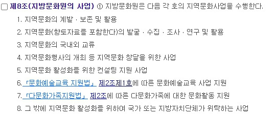 • 지역문화원: 문화원은 지방문화원진흥법을 법적 근거로 설립됐으며, 전국 232 시군구에서 운영되고 있는 특수법인격 비영리 사단법인이다. 법령과 지방문화원 육성지원조례와 광역단체의 법률 검토와 승인으로 작성된 정관에 의해 운영된다. 주요 사업은 지역학 연구와 디지털 아카이브이며 축제, 사회교육, 다문화사업, 문화예술교육사업 등이다. 특히 지역문화원은 문화원뿐 아니라 '지역문화 활성화를 위한 컨설팅 지원사업'도 수행해야 하는 부분이 특징이며, 이는 지역문화원의 역할과 위치를 법령에서 제시하는 의미로 해석된다.