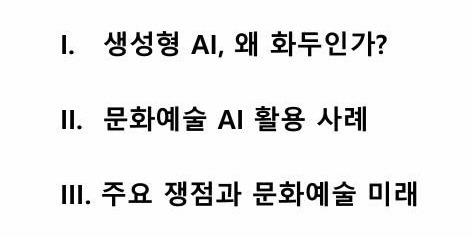 강의 초반에는 AI의 정의와 역할, 그리고 이를 문화예술에 적용한 여러 사례들이 소개되었다. 예술 작품을 자동으로 생성하거나, 소실된 유물을 복원하며, 관람객의 취향을 분석해 개인화된 콘텐츠를 제공하는 AI의 사례는 매우 인상적이었다. 특히, AI가 인간의 창의적 한계를 확장시키는 도구로 작용할 수 있다는 점은 문화예술 분야의 무한한 가능성을 보여주는 대목이었다.
