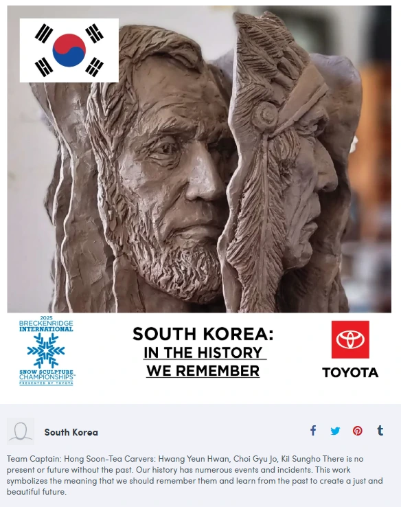 한국대표팀은 19일부터 26일까지 미국 콜로라도 브레켄리지에서 열린 국제 눈조각대회에서 “우리가 기억하는 역사” 주제의 작품으로 참여해 4일간의 시민 투표(People’s Choice) 결과 1위를 차지하며 대회 최고의 영예를 안았다.