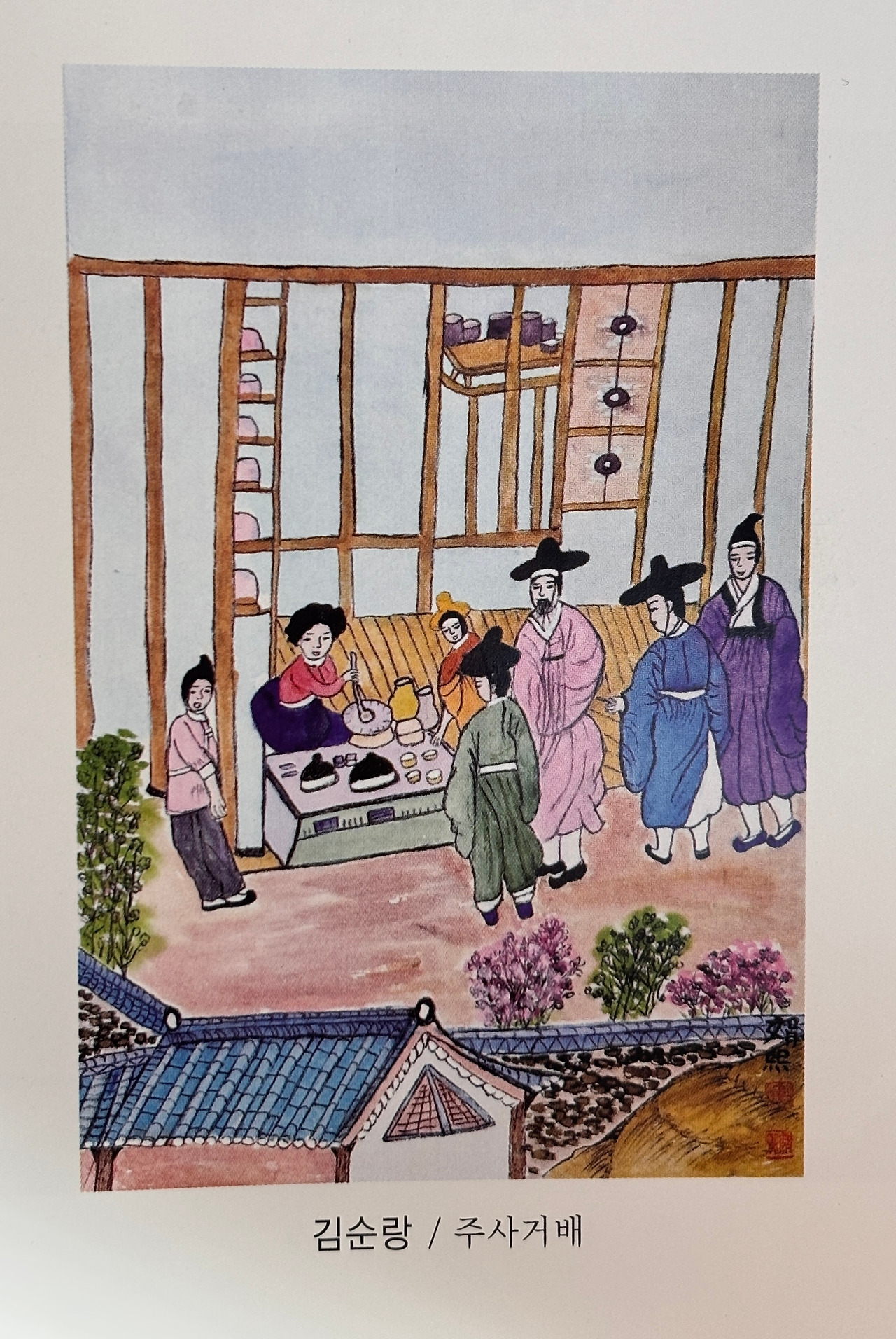 어머니가 그려 화려한 도록에 실린 신윤복의 작품 ‘주사거배‘를 바라보고 있자면, 지난 78년간 꿈에도 그린 어머님의 삶이 보인다. 신윤복의 원작이 지닌 풍류와 일상의 미학을 현대적 감각으로 재해석하며, 가족 중심의 전통적 가치와 공동체적 정서를 강조한다. 색채와 인물 배치를 통해 환대와 교류의 상징성을 시각화하며, 공간의 개방성 속에서 사회적 위계와 관계망을 섬세하게 드러내는 기호학적 접근이 돋보인다.