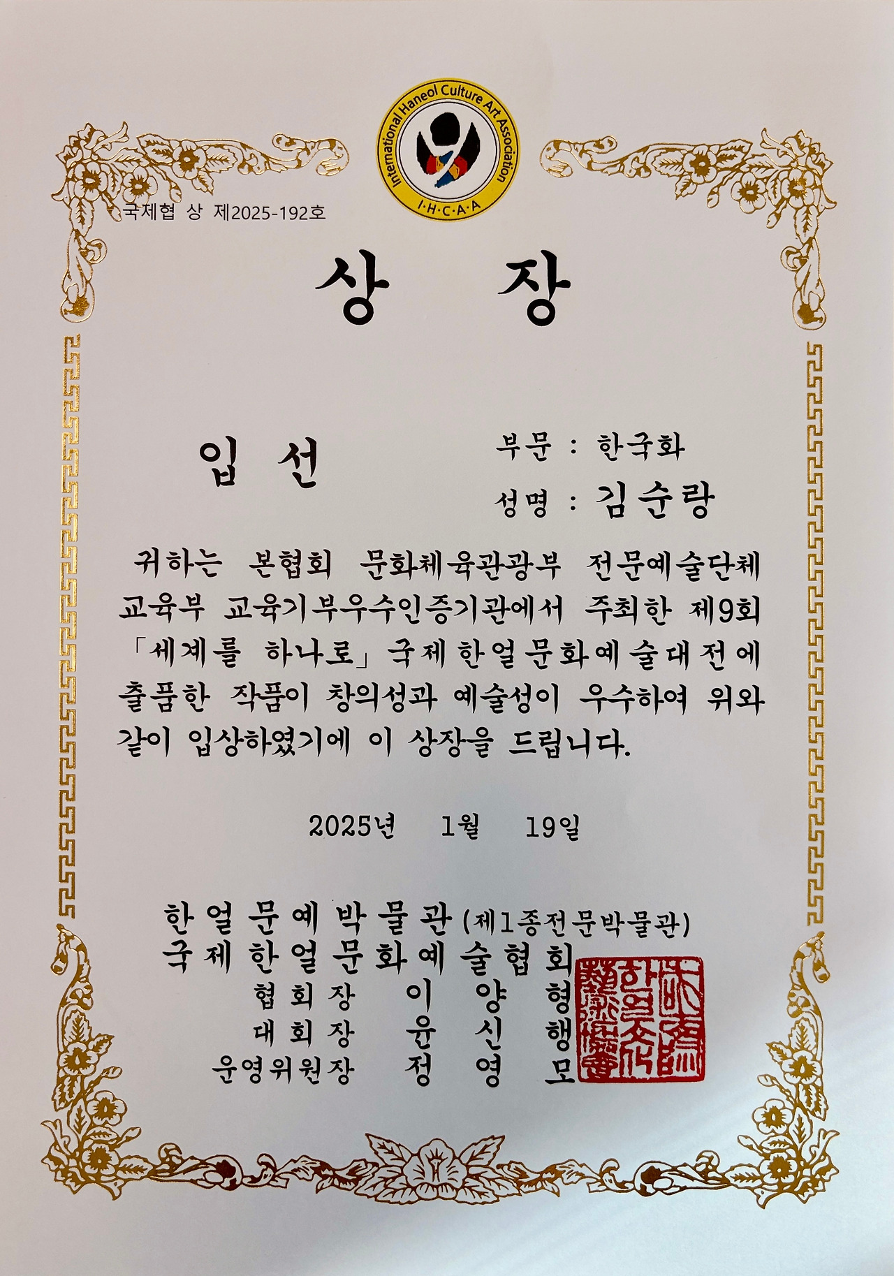 어머니 김순랑 여사는 7학년 8반으로 한국나이 78세다. 76세 되던해 시민센터 공개강좌로 미술에 입문하셨다. 입문 2년 만인 올 1월 전국 규모 미술대전 한국화 부문에서 ‘입선’ 수상자로 선정됐다. 창작의 나이는 한계가 아닌 가능성의 또 다른 이름임을 증명하셨다. 예술이 삶의 어느 순간에도 피어날 수 있음을 보여주는 한 사례로, 세대와 시대를 초월한 창작의 본질을 환기시킨다.