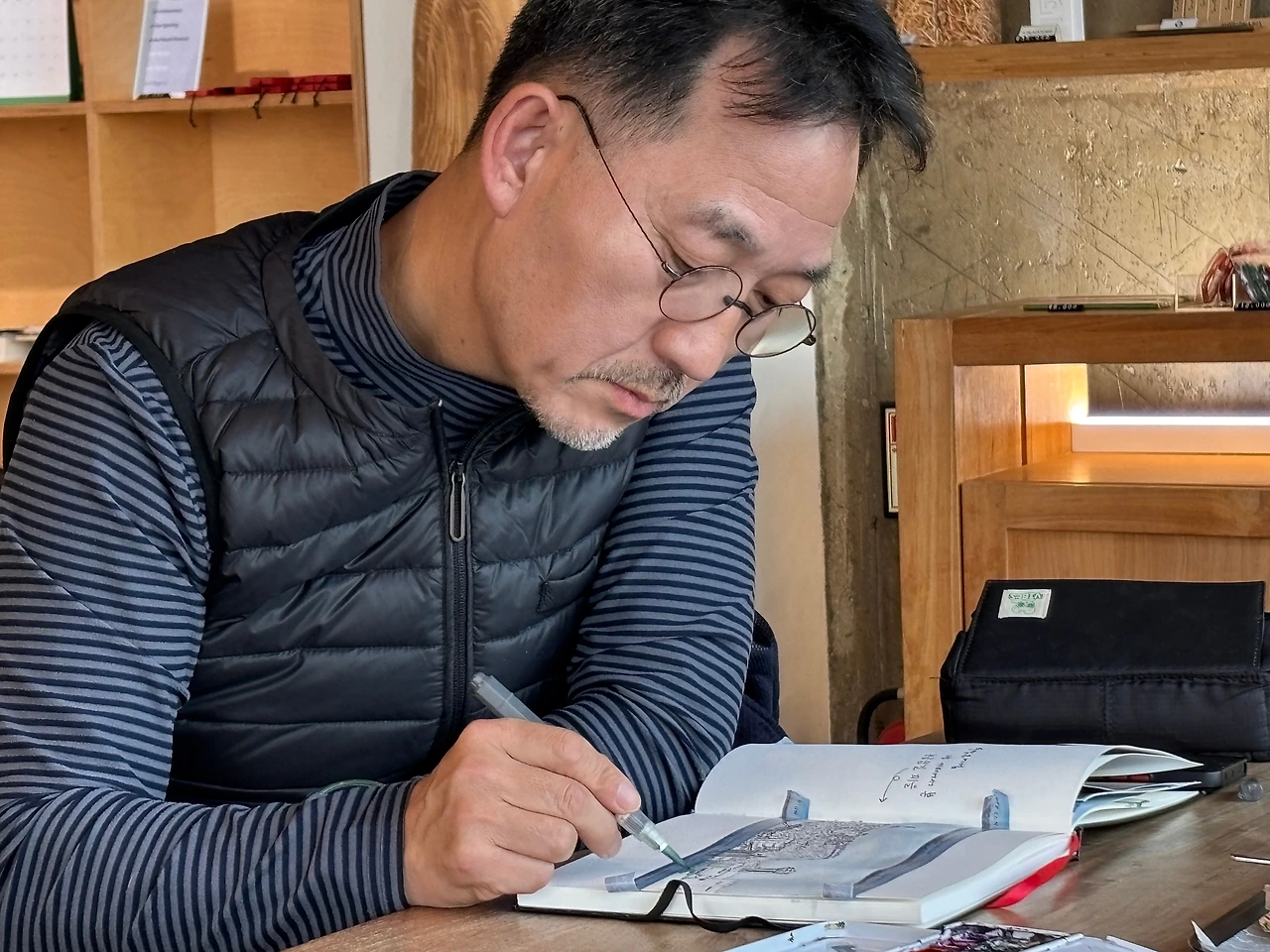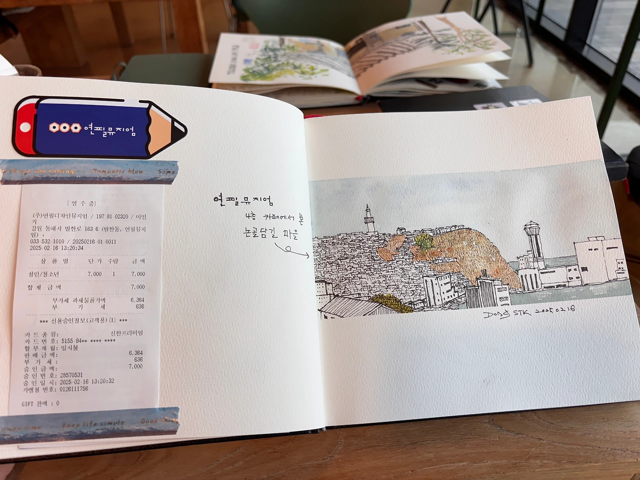 16일, 동해 북쪽 마을 언덕에 자리 잡은 연필뮤지엄 ‘해당화' 주제의 카페에서 그림일기로 여행을 기록하는 박동식 작가를 만났다. 박 작가는 3박 4일간 묵호여행을 왔다고 한다. 막걸리학교 트레킹 클럽 일정을 마치고 뮤지엄을 방문한 허시명 교장 등과 활동하는 여행작가협회 회원이기도 하다. 자유롭게 이동하며 삶을 즐기는 유목민처럼 여행을 즐긴다는 의미일까요? 자칭 유목여행자로 칭하는 박 작가는 지난 연말에도 그림일기로 태국 치앙마이 여행을 다녀왔다면서 그림일기를 2권씩 내놓는다. 일기장 속에는 현장의 그림과 이동에서 발생하는 각종 영수증, 입장권, 현지 꽃 등도 같이 담았다.