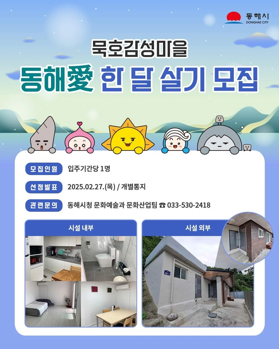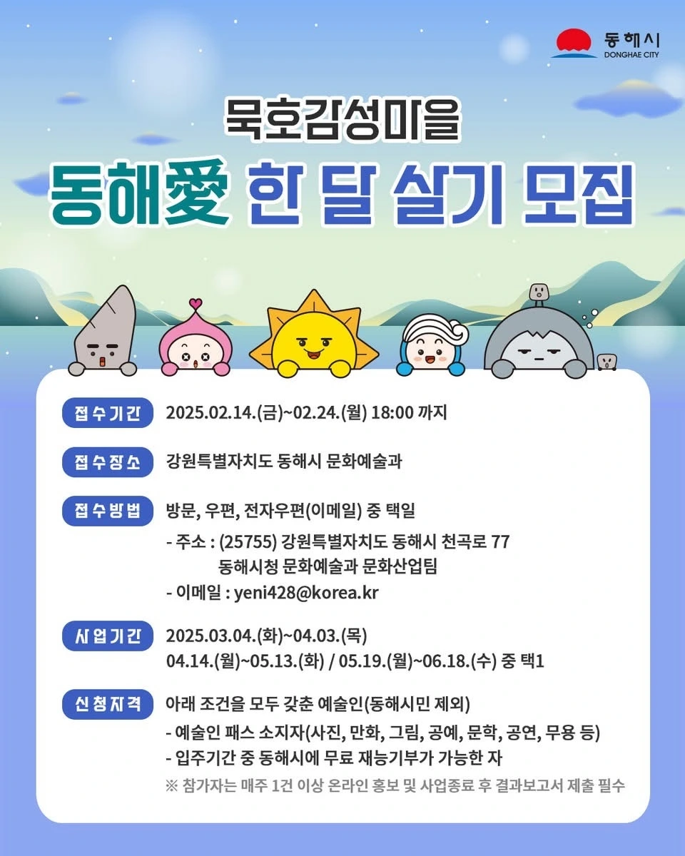 이번 ‘동해愛 한 달 살기’ 프로그램은 예술인들에게는 창작의 새로운 장을, 지역 사회에는 문화적 풍요로움을 더하는 계기가 될 것이다. 예술과 삶의 조화를 추구하는 분들의 많은 관심과 참여를 기대한다.