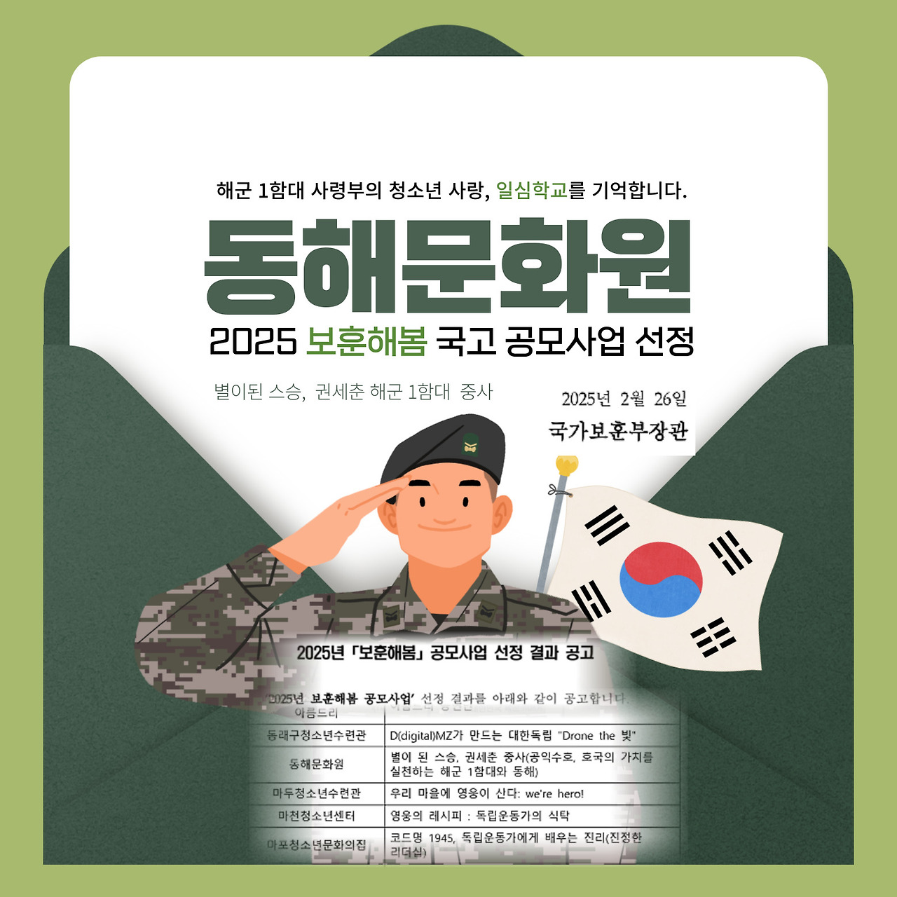 동해문화원이 해군 1함대사령부의 청소년 사랑 결실인 '일심학교'이야기를 배경으로 제안한 "별이 된 스승, 권세춘 해군중사"가 국가보훈부 2025년 ‘보훈해봄’ 국고 공모사업에 선정되어 국비 3천만 원을 확보했다.