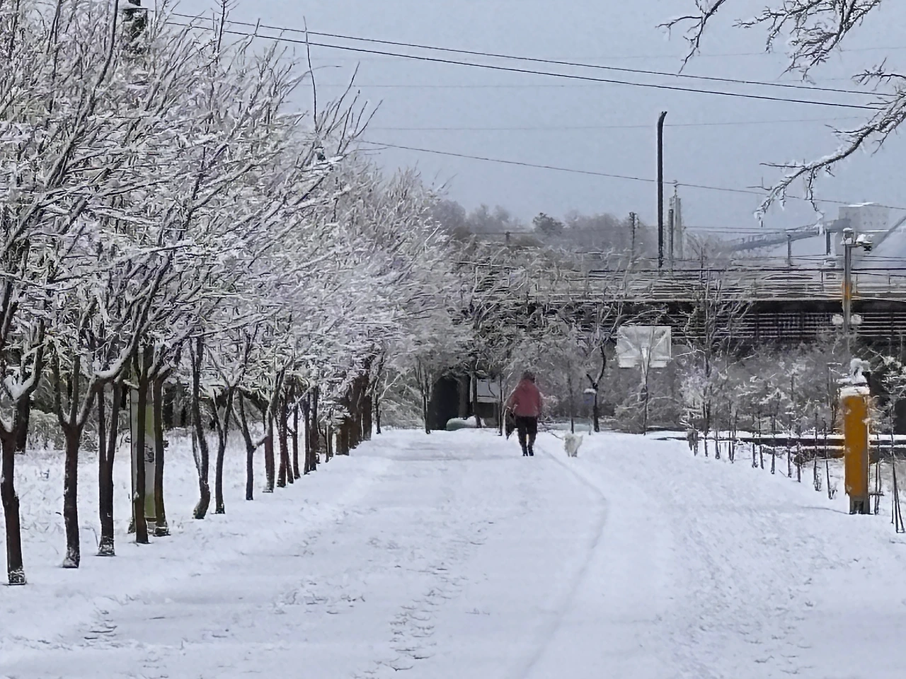 강물 위로 흩날리는 눈, 걷는 사람들의 발자국, 산책길에서 마주친 강아지와 가족의 조용한 대화.