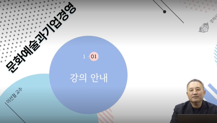 대학원 3학기 강의가 3일 시작됐다. 첫 강의는 이선철 교수(경희사이버대학교 대학원 문화예술경영 전공)의 ’문화예술과 기업경영’이다. 1,2강으로 시작된 강의는 이론적 접근보다 문화예술 기획자로서 실무적 사고를 확장하는 중요한 시간이 되었다. 강의를 담당한 교수는 강의 계획, 강사의 철학과 경험이 녹아든 강사소개를 이어갔다.