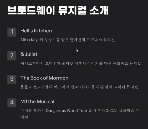 [읽어두기] 교수가 소개한 브로드웨이 뮤지컬 4편의 특징과 매력, 추천 이유를 요약했다.