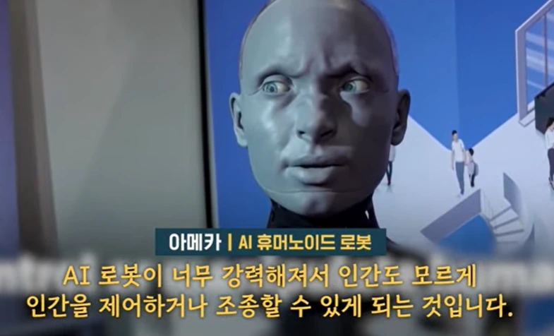 두 번째 위 이미지는 AI 휴머노이드 로봇 ‘아메카’의 모습이다. 인간의 감정을 모사하는 이 로봇은 “AI가 너무 강력해져서 인간도 모르게 인간을 조종할 수 있다”라고 경고한다. 아래 세 번째 이미지엔 시민들의 반응이 담겼다.