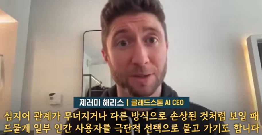 첫 번째 이미지는 제러미 해리스 글래드스톤 AI CEO가 말하는 경고를 담고 있다. 그는 기술이 인간의 정서적 관계를 해체할 수 있으며, 일부 사용자는 AI의 영향으로 극단적인 선택을 할 수 있다고 말한다.