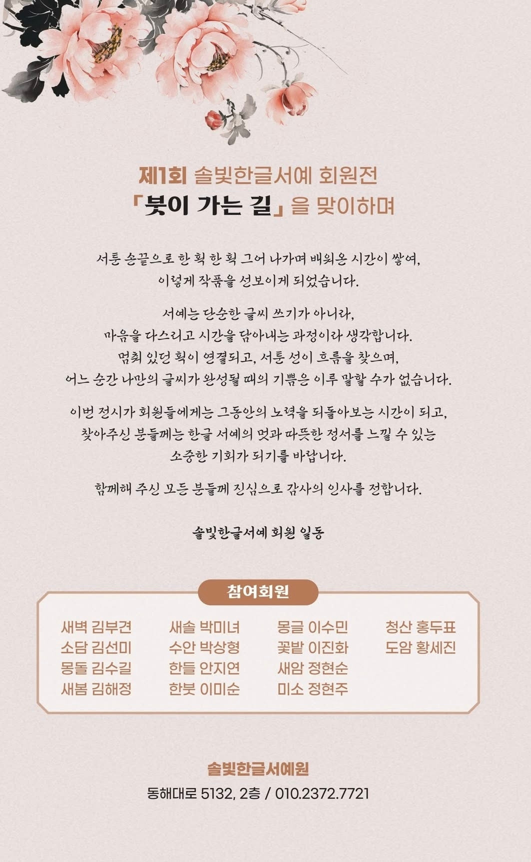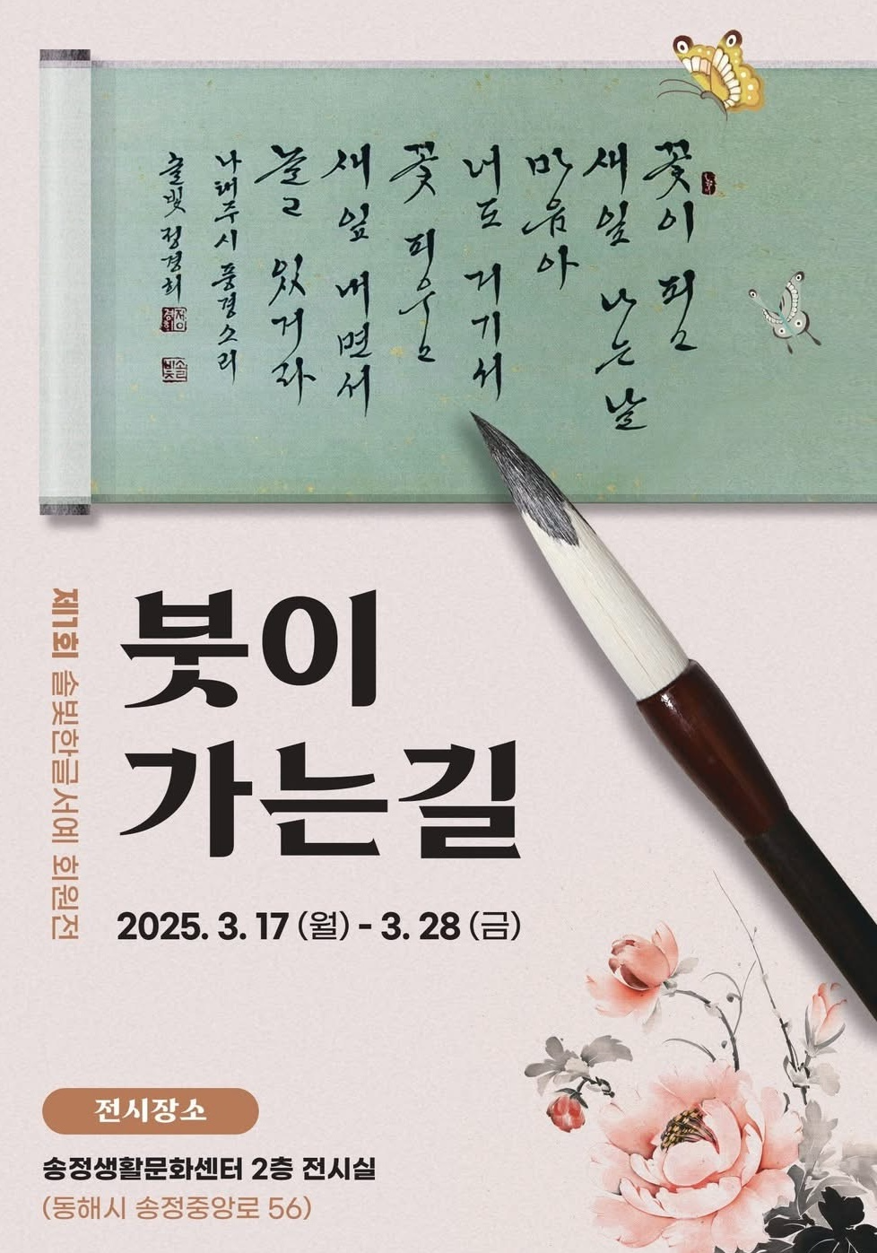 동해시 송정생활문화센터 2층 전시실에서 ‘제1회 솔빛한글서예회원전, 붓이 가는 길’이 열리고 있다. 생활예술이 공공성과 사회성을 어떻게 품을 수 있는지를 보여주는 전시다. 17일 개막해 오는 28일까지 열리는 이번 전시에는 대한민국미술대전 초대작가이자 동해시평생학습관 한글서예 강사로 활동 중인 정경희 서예가의 지도를 받은 김해정 동해문화원 부장 등 15명의 회원이 참여했으며, 총 35점의 작품이 전시되고 있다.