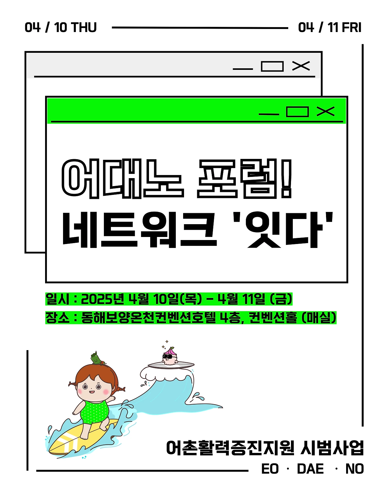 [포럼] 동해시와 협동조합문화발전소공감이 주최하는 ‘어대노포럼! 네트워크 잇다’가 오는 4월 10일부터 11일까지 강원도 동해보양온천컨벤션호텔에서 컨벤션 홀에서 열린다.