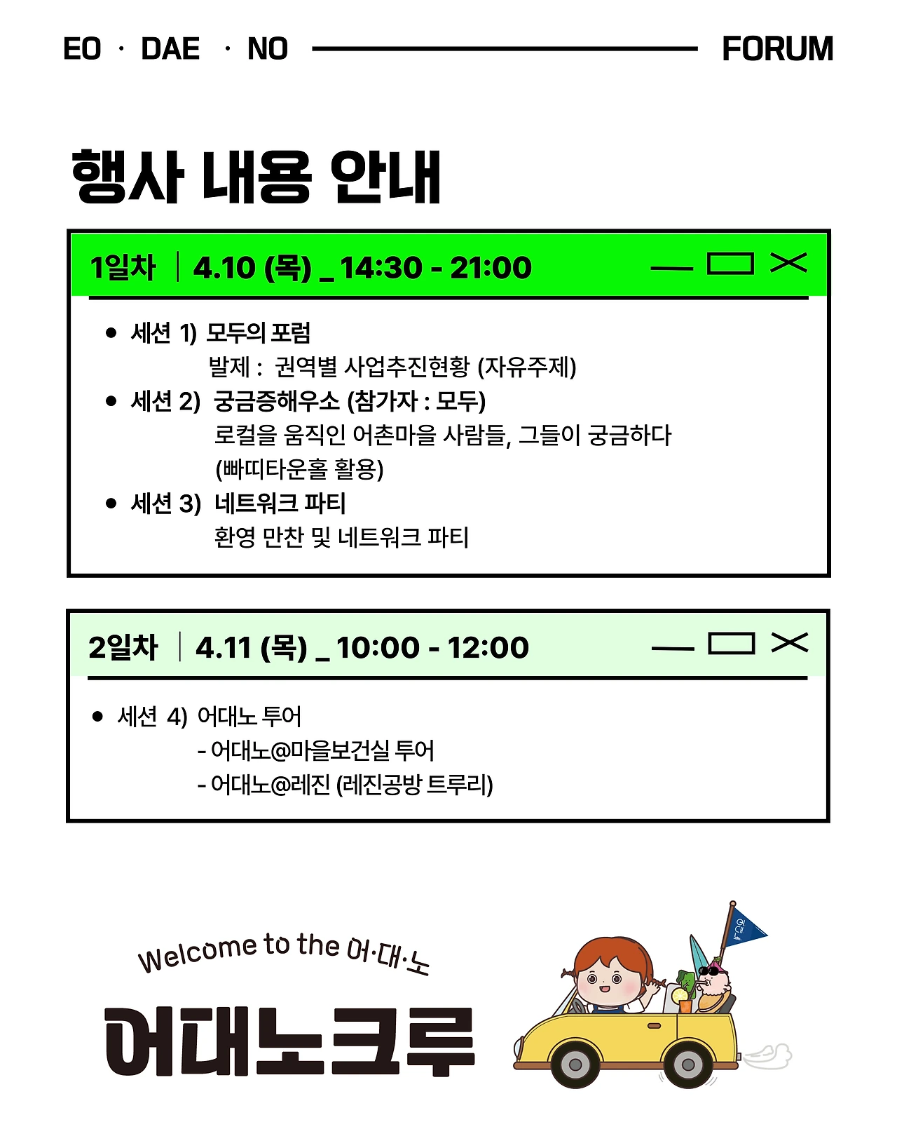 행사는 1박 2일 동안 진행되며, 첫날에는 포럼 발표와 자유토크, 네트워크 파티가 예정되어 있다. 특히 네트워크 파티에서는 지역 특산물과 음악 공연이 어우러져 참가자 간 교류를 촉진할 예정이다. 둘째 날에는 ‘어대노 투어’ 프로그램을 통해 마을 보건실 및 레진공방 체험 등 현장을 직접 탐방하며 어촌 활성화 사례를 경험할 기회를 제공한다.