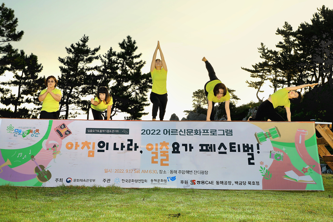 동해문화원은 일출명소 추암 자연 자원 일출을 배경으로 3년째 일출요가 프로젝트를 추진하고 있다. 코로나에 지친 주민을 위로하기 위해 마련한 아침 축제 <아침의 나라 동해페스티벌>을 2021년에 첫선을 보였다. 당시 프로그램에 함께 참여한 문화기획자 류재현 감독은 MBC 열린 채널 인터뷰에서 <발전가능성 높고 확장성 풍부한 자연 활용 기대되는 콘텐츠다.>라고 했다. 고령화 사회에서 발생하는 사회적 육체, 정신 건강에 도움을 주기 위해 시도한 <2022년 어르신문화프로그램, 일출요가 페스티벌>을 운영해 본 결과 참가자 만족도가 높고 각종 언론은 <몰디브 부럽잖은 동해 일출요가_헤럴드경제> , <동해 일출 보며 요가 즐겨요_투어코리아>등 멋진 카피로 응원하기도 했다.