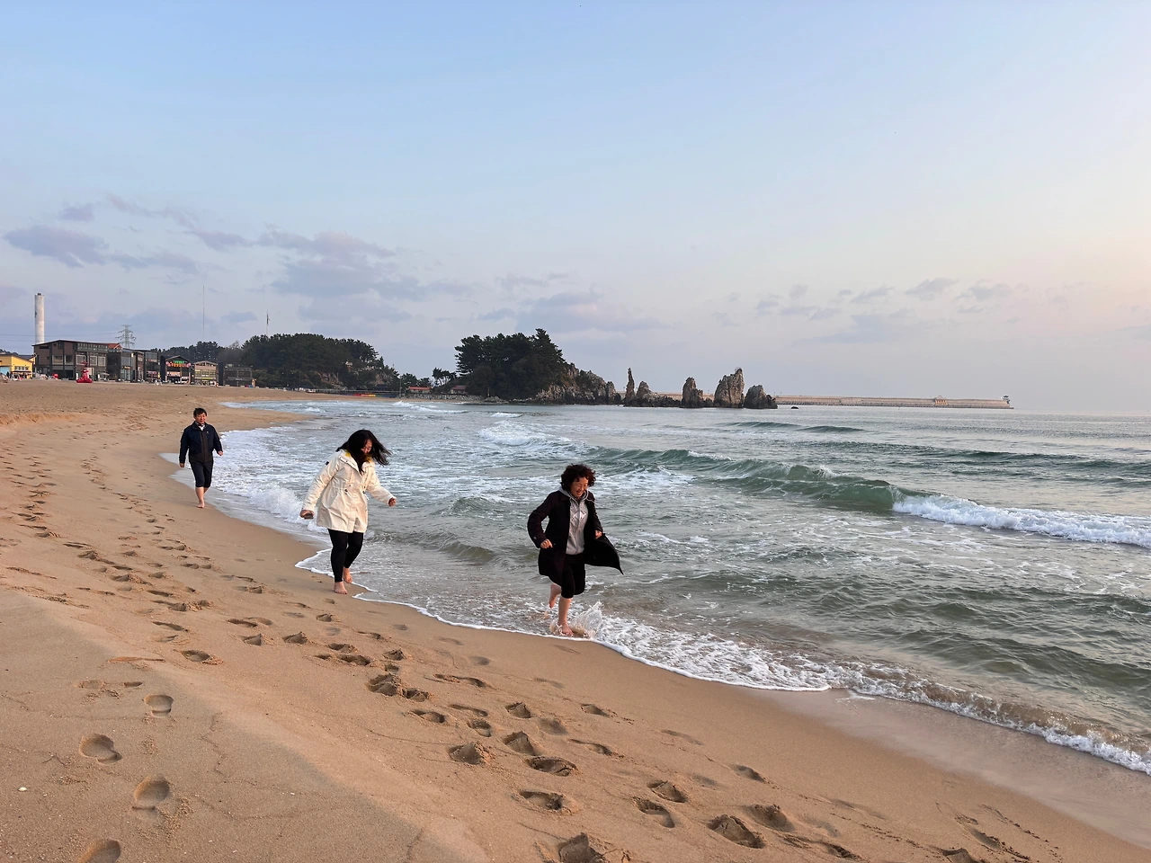 일행은 새벽 3시 춘천을 출발할 정도로 영혼이 맑은 분들입니다. 3시간을 달려 도착한 추암은 여명이 일출을 기다리는 시간이었습니다. 두 손을 높이 흔들며 반갑게 추암에 도착했습니다. 처음엔 모래의 차가움에 놀라던 발끝에 곧 환호가 터졌습니다.