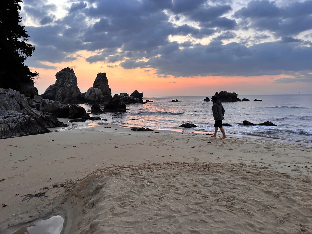 부드러운 모래, 발바닥을 깨우는 자연에너지와의 소통, 촛대바위 너머로 떨어지는 해.