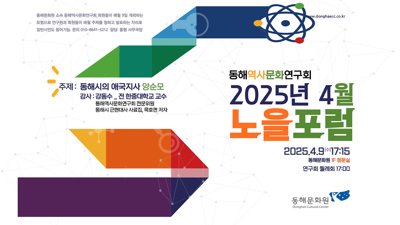 한편, ‘노을포럼’은 동해역사문화연구회가 매월 운영하는 문화포럼으로, 지역학을 중심으로 역사, 인물, 공간, 기억을 주제로 마련된다. 동해시의 대표적인 지역학 포럼인 '노을포럼'은 시민 누구나 참석 가능하다.