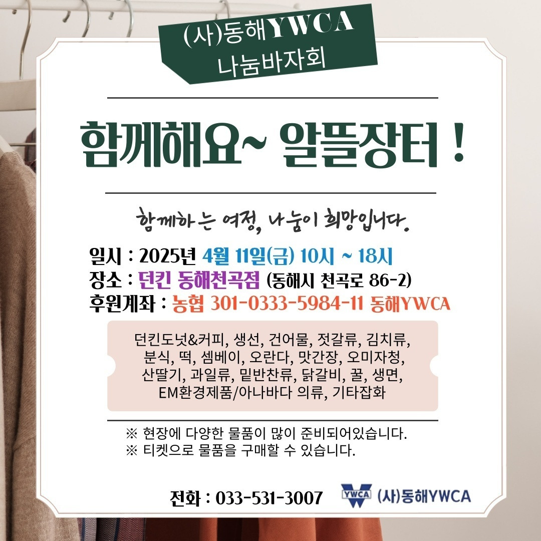 2025년 4월 11일 금요일, 동해 YWCA가 준비한 작은 시장이 열린다.