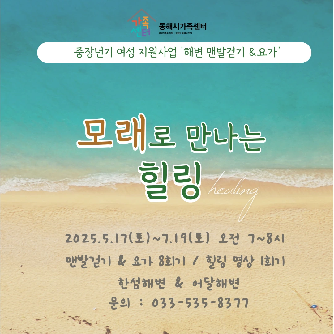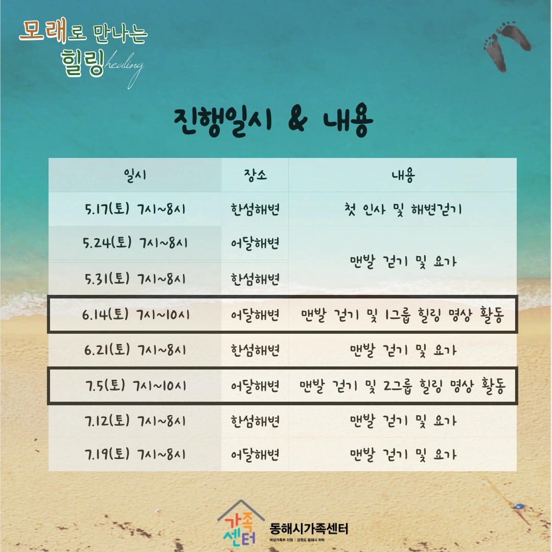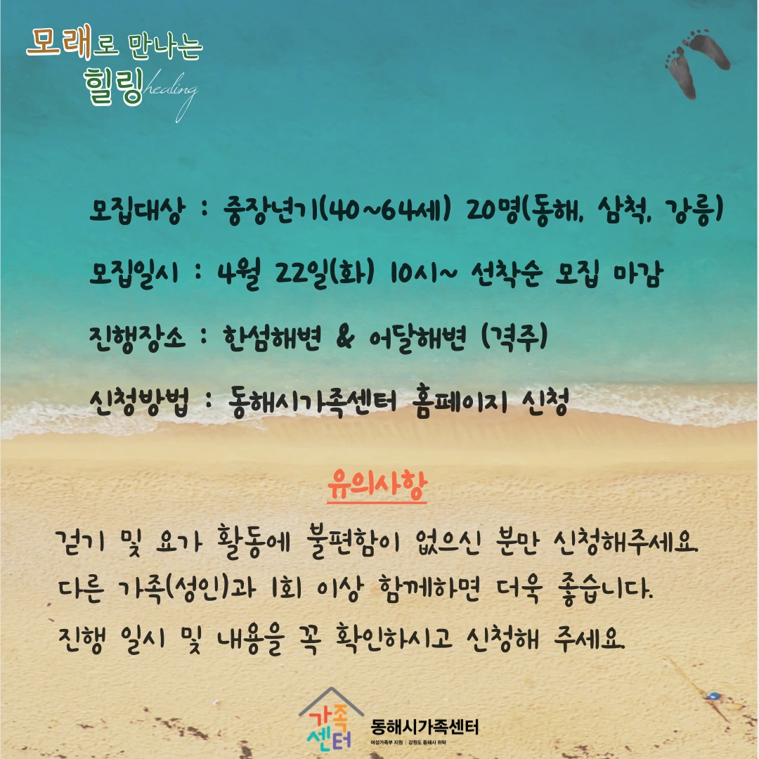 동해시가족센터 우미강 센터장은 “모래를 밟고 걷는 행위는 자신을 마주하는 치유의 행위다”며, “이번 프로그램이 참여자들에게 삶의 속도를 잠시 늦추고 자기 돌봄의 기회를 제공하는 계기가 되길 바란다”라고 밝혔다.