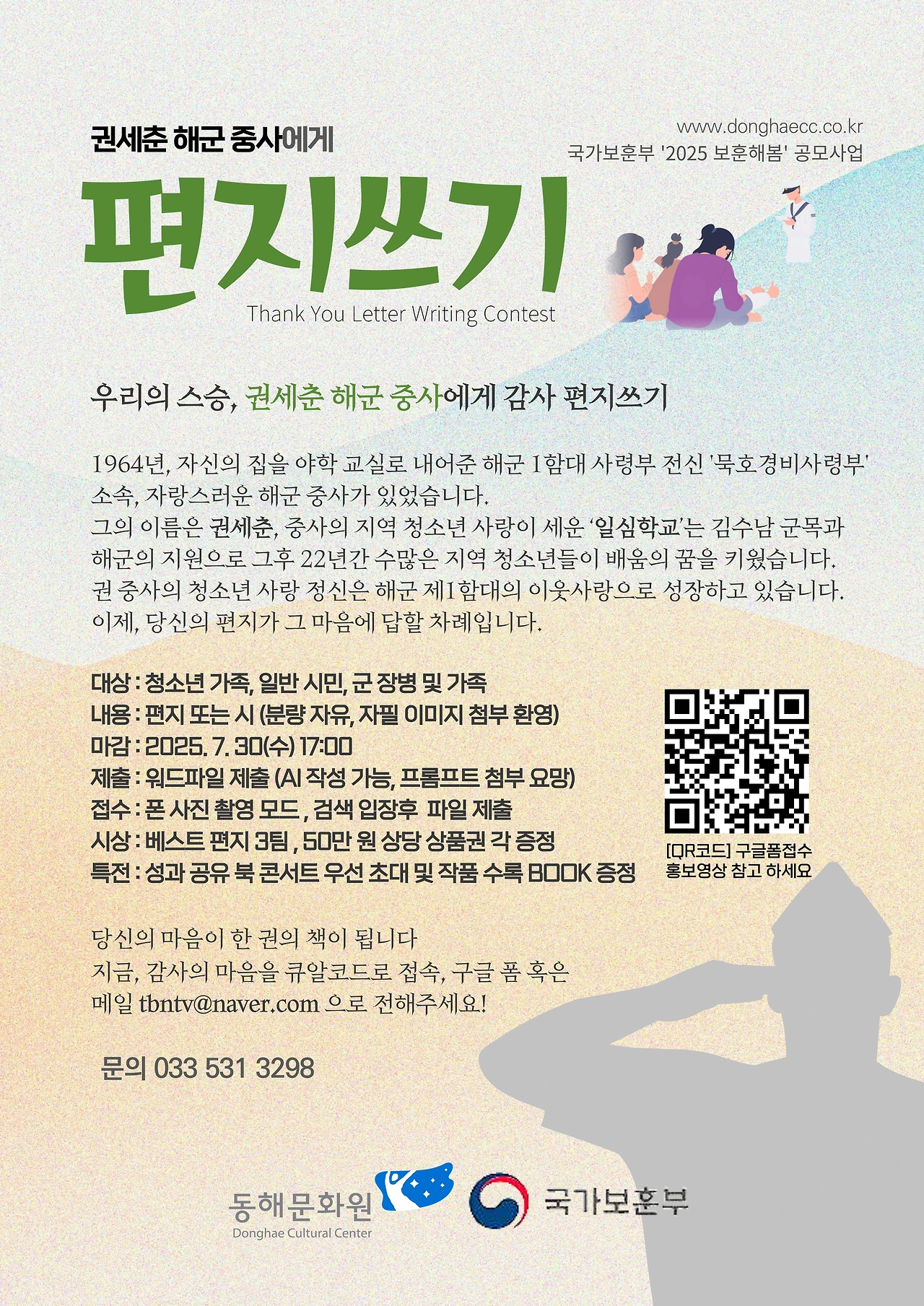 이 캠페인은 국가보훈부가 주관하는 ‘보훈해봄’ 공모사업의 일환으로 진행되며, 오는 7월 말까지 누구나 동해문화원 홈페이지에 공개된 자료와 영상을 참고해 권 중사에게 보내는 편지를 작성할 수 있다. 접수된 편지들은 가을 북콘서트에서 책으로 엮어 발표되며, 참가자 가족에게도 전달된다. 특히 우수 편지 3팀에게는 상장과 함께 50만 원 상당의 상품권이 수여될 예정이다.