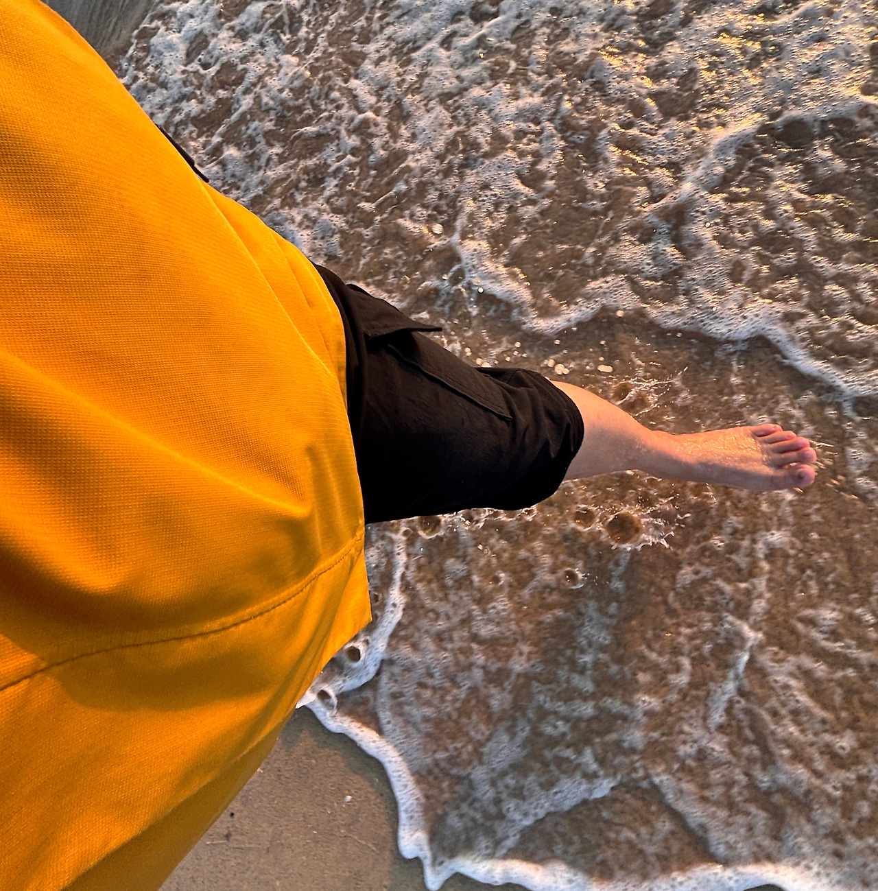 그는 신발을 벗고 조심스레 해변 위에 발을 올리면서도 어딘가 쑥스러워 보였다.