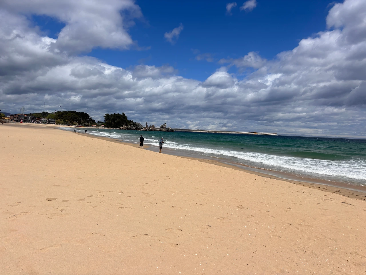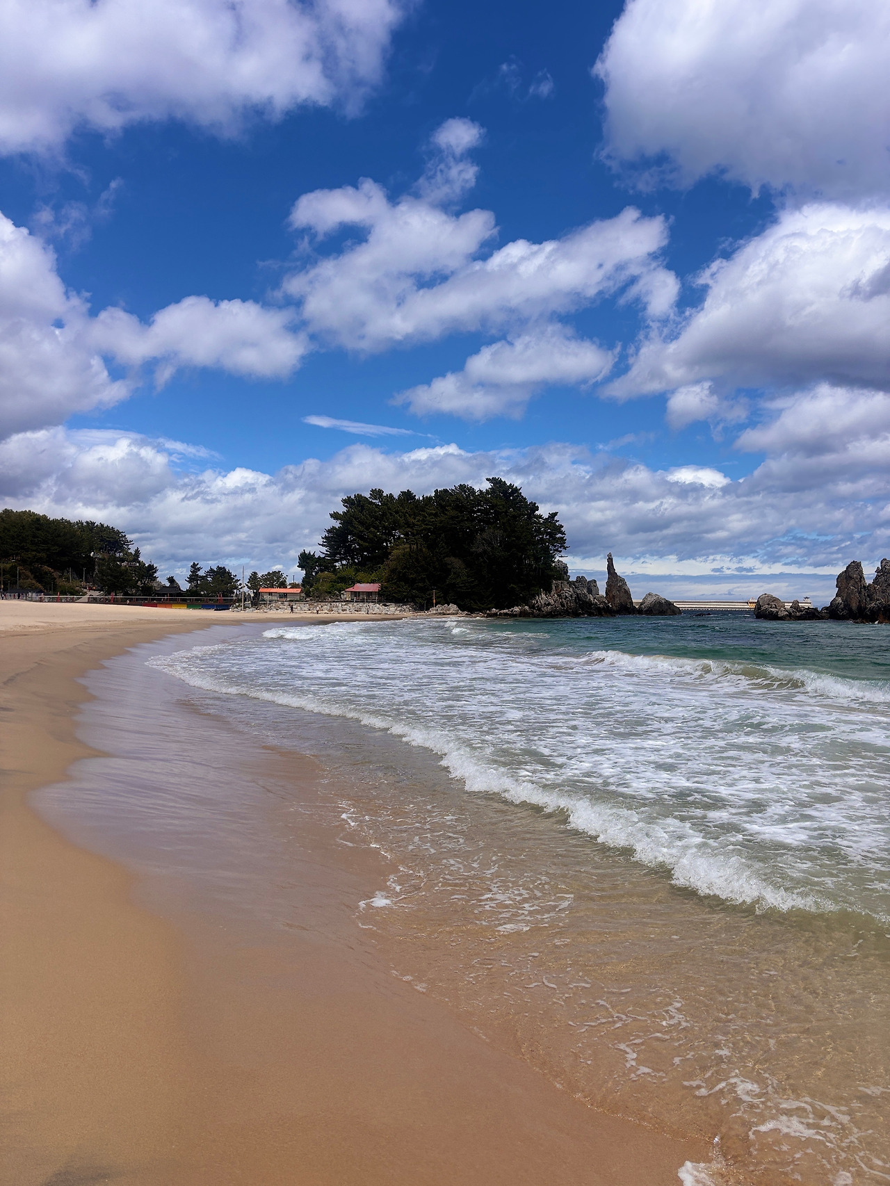 비가 그친 오후, 동해 추암 해변은 유난히 빛난다. 하늘은 갓 물감으로 칠한 듯 파랗고, 바다는 그 색을 고스란히 안고 반짝인다. 맨발로 모래를 밟자 축축하고 서늘한 감촉이 발바닥을 깨운다. 비에 젖은 모래는 단단해 발자국을 선명히 남긴다. 멀리 촛대바위가 당당히 서 있고, 파도 소리가 부드럽게 귓가를 스친다. 공기엔 짭짤한 바다 냄새와 비 내음이 섞여 코끝을 간질인다.