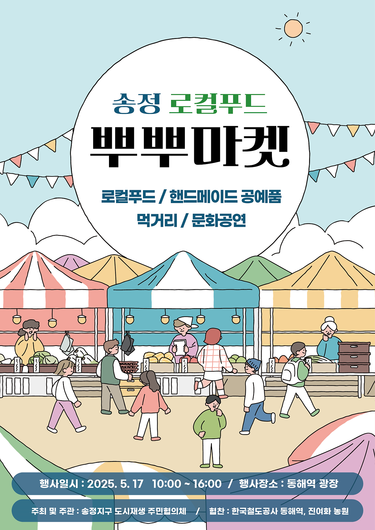 동해시 도시재생 송정지구 주민협의체가 주관하는 ‘로컬푸드 뿌뿌마켓’이 17일, 동해역 광장에서 열린다. 마켓은 오전 10시부터 오후 4시까지 지역 농산물 판매와 업사이클 제품, 핸드메이드 작품과 공연 등을 선보일 예정이다.