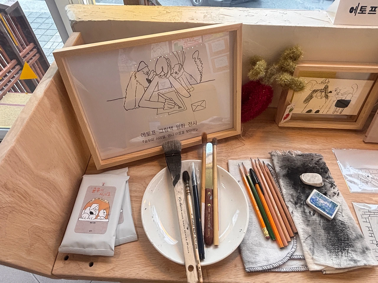 작가의 작업 테이블이 고스란히 재현된 공간도 시선을 끈다. 연필, 잉크, 붓, 책갈피, 그리고 반쯤 마신 커피잔까지, 작업의 흔적들이 ‘그림책이 태어나는 자리’의 숨결을 전한다. 마치 작가가 잠시 산책을 나간 사이, 우리가 몰래 그의 작업실을 방문한 기분이랄까.