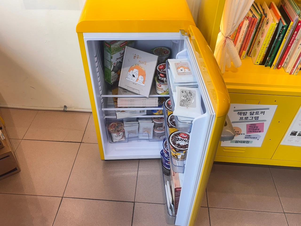 친절한 책방지기님의 안내와 노란 냉장고였다. 순무와 시리얼 전시 소개를 안내받는 순간 책방지기는 노란 냉장고 문을 열었다. 노란 냉장고 속에는 아이스크림 사이로 시리얼 대신 그림책 순무 시리얼이 지키고 있는 모습이다. 야... 저 책은 시원하겠다. 동해시 송정 동해역 앞 작은 책방 안, '순무와 시리얼'의 전시는 그렇게 의외의 장소에서, 무심한 듯 기발하게 펼쳐지고 있었다.