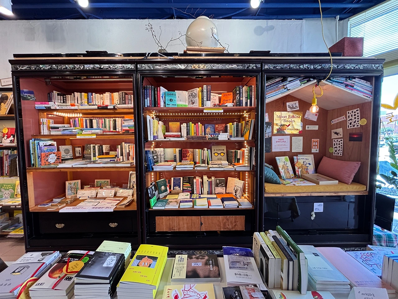 동해, 바다가 반기는 유일한 KTX 열차 여행에서 만나는 동해역 앞 한켠. 유리문을 열고 들어서면 마주하는 ‘책방 달토끼’ 안쪽에는, 기이한 전시장이 하나 있다. 따로 제작된 인테리어가 아니다. 세월을 품은, 누군가의 생을 오래도록 곁에서 지켜본 가구… 바로 어머니가 쓰시던 자개장롱이다. 장롱의 깊숙한 품은 이제 책과 책 이야기를 품는다. 수십 년간 이불과 한복을 지켰던 공간이, 이제는 독서와 번역 그림책, 문화예술 전시의 중심이 되었다.
