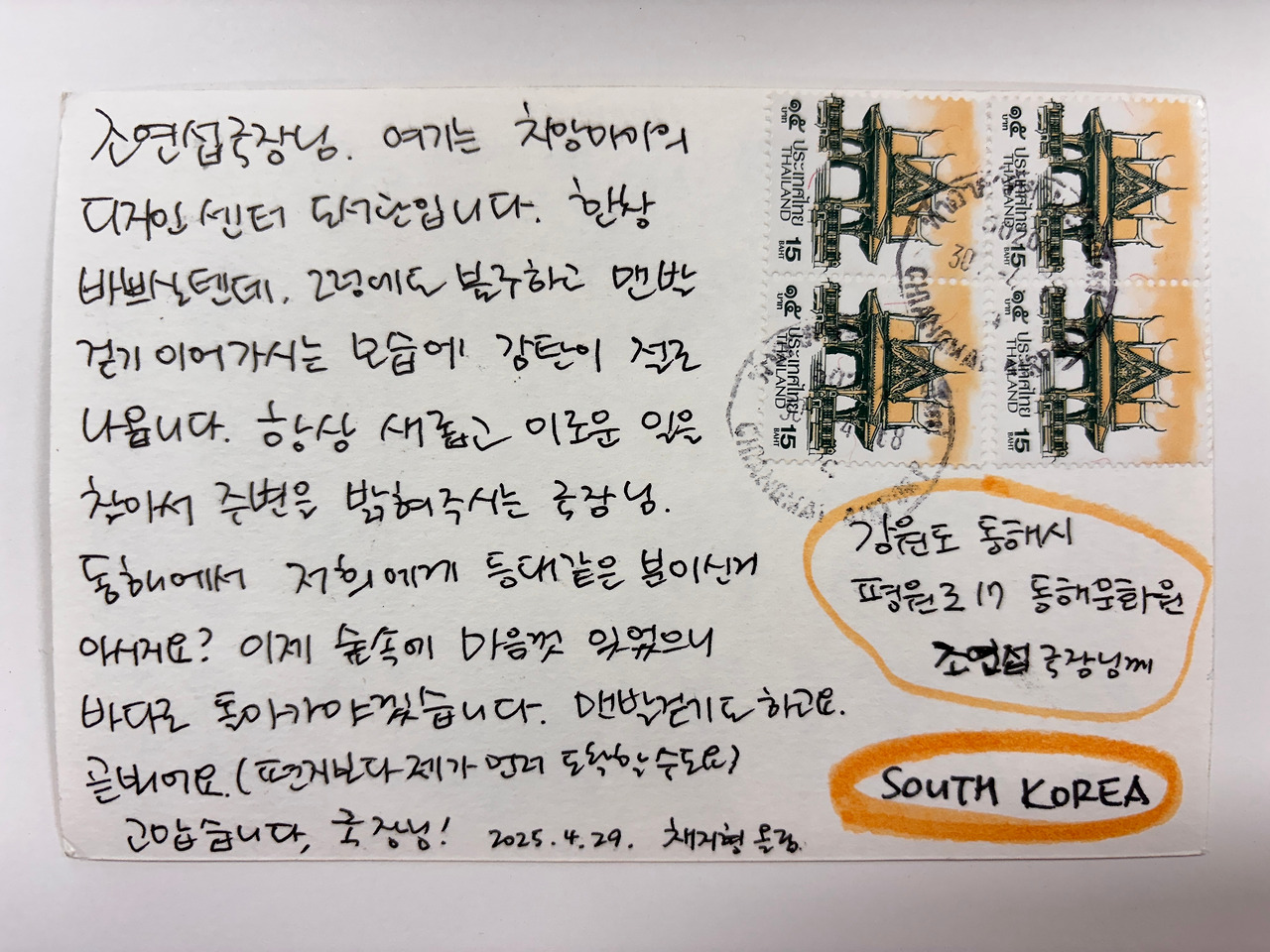 태국 북부의 도시, 치앙마이에서 엽서 한 장이 도착했다. 사무실 직원은 ‘죄송하지만 어쩔 수 없이 먼저 읽었어요.‘ 라며 바다를 건너온 엽서를 건네줬다.