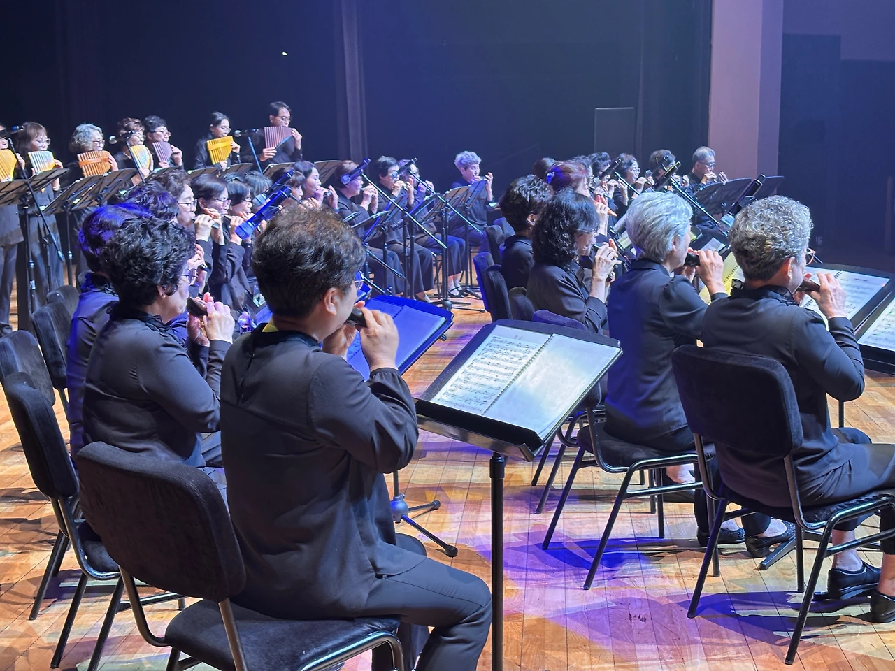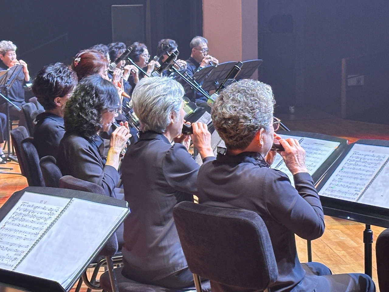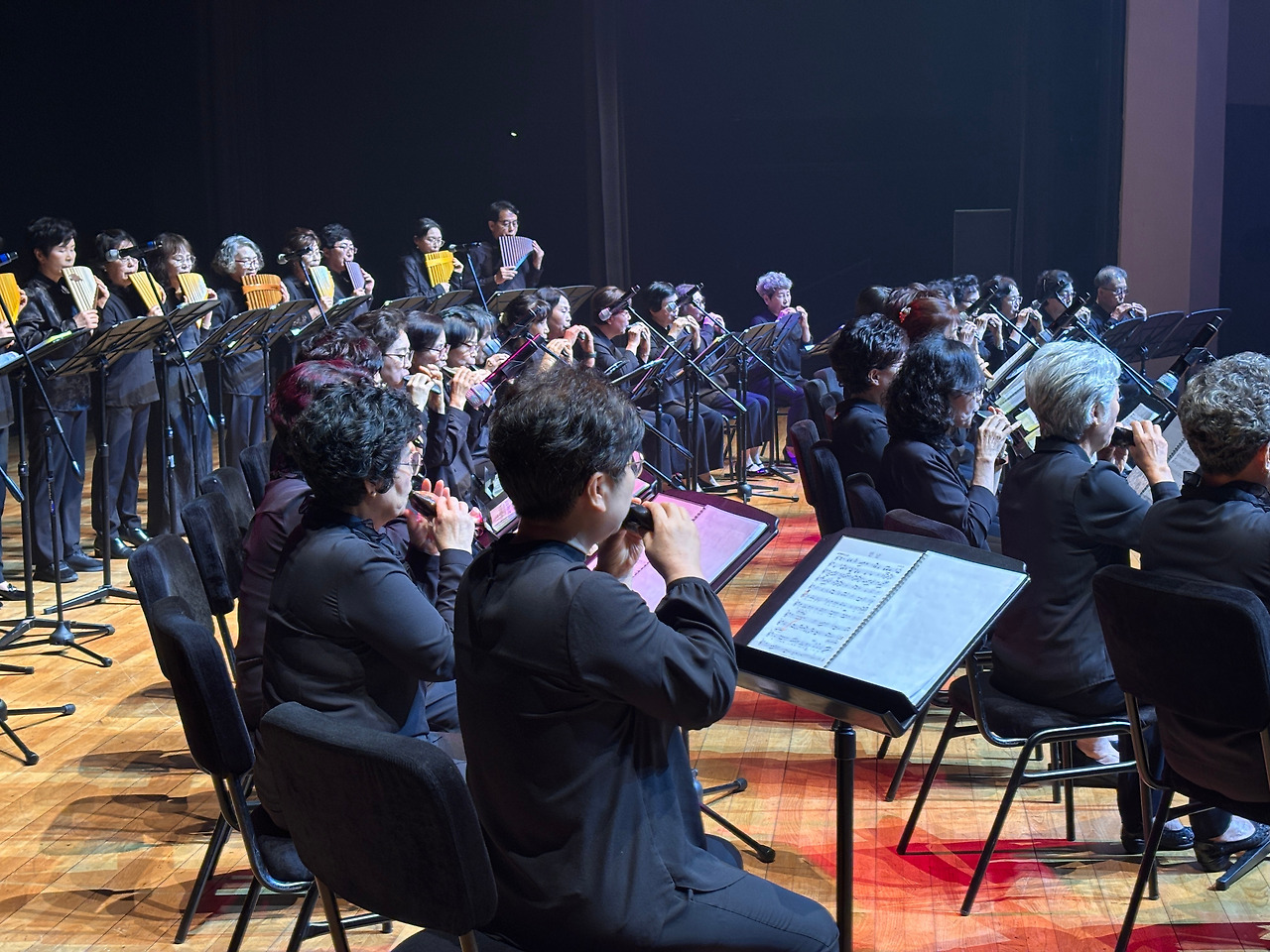 ‘행복드림’이라는 이름처럼, 이번 무대는 삶의 황혼에 다시 피어나는 음악의 숨결을 주제로 구성되었으며, 오카리나, 팬플룻, 오보에, 하모니카, 대금, 성악, 합주, 전통무용 등 다양한 장르가 조화롭게 어우러졌다. 공연은 심재춘 지부장의 지휘 아래 ‘다 함께 오케스트라’의 「만남」, 「사랑 찾아 인생 찾아」, 「젊은 그대」 등 인생의 여정을 노래한 곡들로 시작되었고, 이어진 실버예술 오카리나와 하모프렌즈의 감성 짙은 연주가 관객을 사로잡았다.