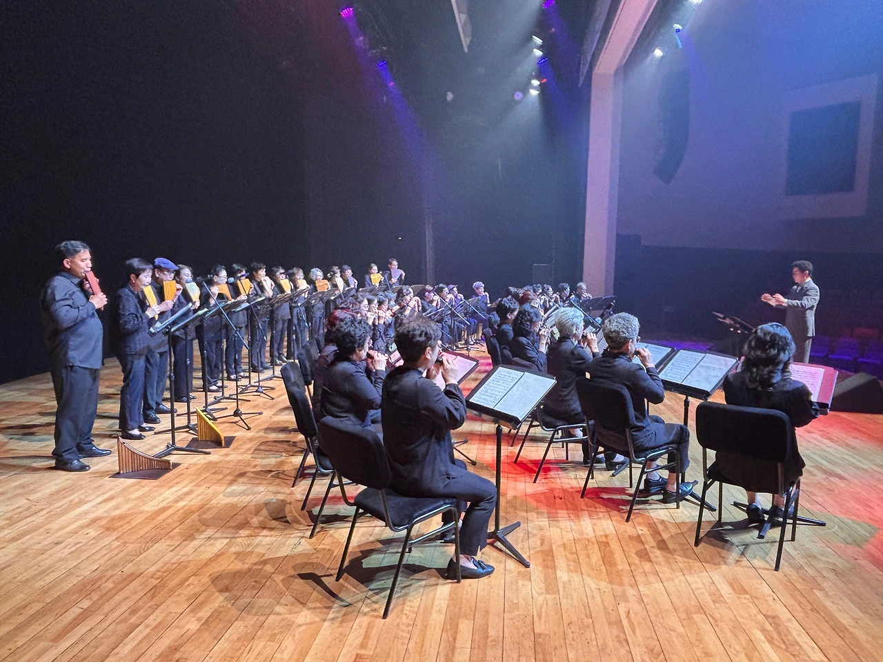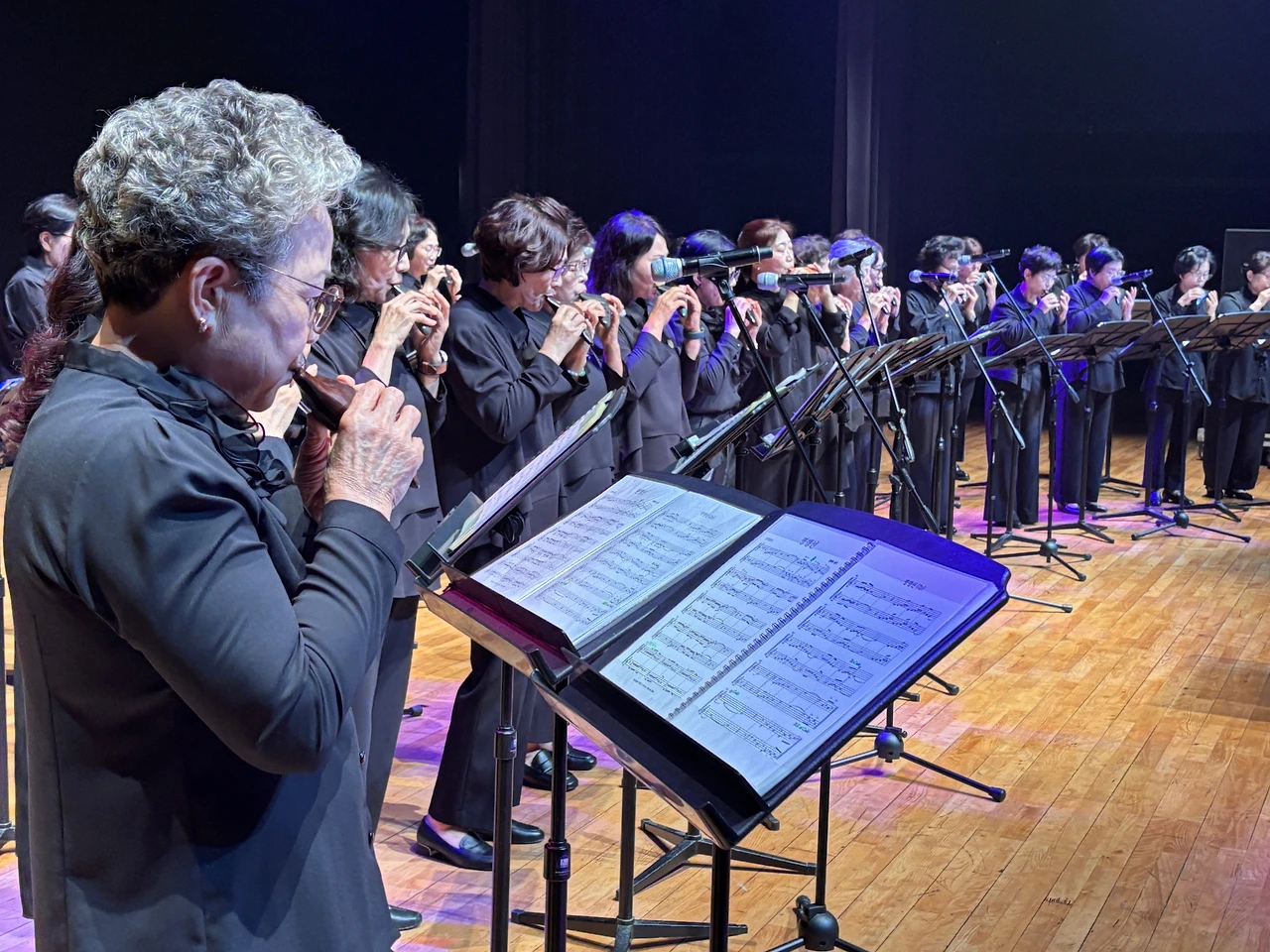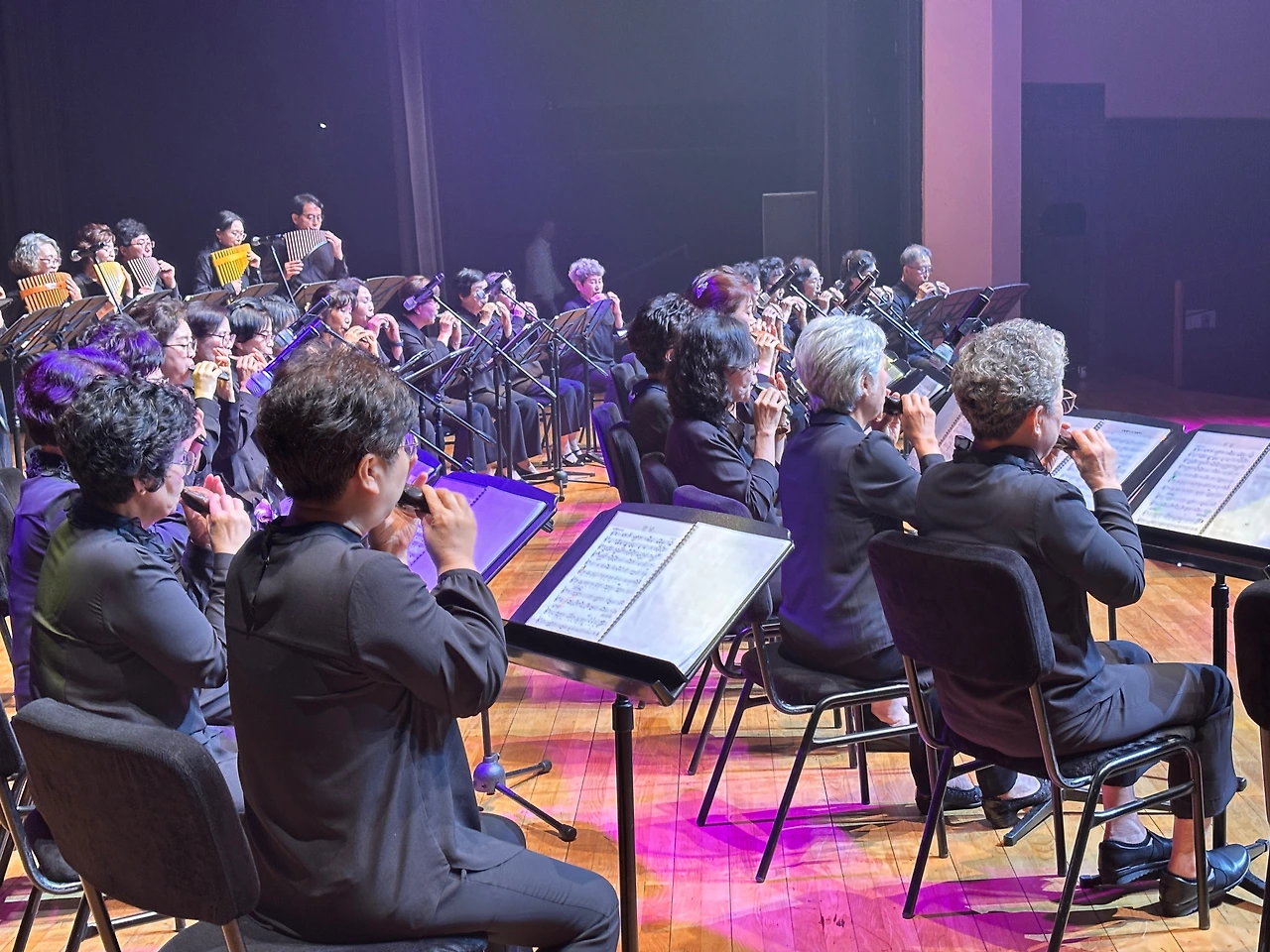‘행복드림’이라는 이름처럼, 이번 무대는 삶의 황혼에 다시 피어나는 음악의 숨결을 주제로 구성되었으며, 오카리나, 팬플룻, 오보에, 하모니카, 대금, 성악, 합주, 전통무용 등 다양한 장르가 조화롭게 어우러졌다. 공연은 심재춘 지부장의 지휘 아래 ‘다 함께 오케스트라’의 「만남」, 「사랑 찾아 인생 찾아」, 「젊은 그대」 등 인생의 여정을 노래한 곡들로 시작되었고, 이어진 실버예술 오카리나와 하모프렌즈의 감성 짙은 연주가 관객을 사로잡았다.