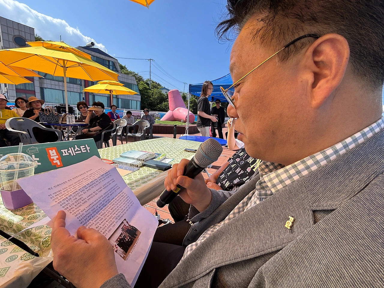 첫째 날 북 페스타에서는 권세춘 해군 중사의 실화를 바탕으로 한 청소년 가족 편지 쓰기 캠페인을 시작으로, 작가와의 대화, 동해시민합창단의 무대, 글 풍년 콘서트가 이어졌고, 60건이 넘는 편지가 현장에서 접수되어 목표치를 두 배 이상 넘기는 성과를 냈다. 특히 해군 제1함대 사령부 곽광섭 사령관이 방문해 낭송해 준 양광모 시인의 '멈추지 마라'는 동해 수평선을 다시 바라보게 하는 멋진 시간이었다. 화려한 문체보다 일상의 담백한 언어로 삶의 정서를 노래하는 이 시를 감상한 자리에 참석한 오종식 동해문화원장은 "건강한 목소리로 마지막 "소절, 태풍 불어도 거친 동해 바다로 나아가라!"를 낭송할 때 눈물이 글썽이기도 했다. 곽 사령관의 우렁찬 목소리를 오래 기억하고 권세춘 해군중사의 공익수호 정신이 동해시민의 정신으로 승화되길 바란다."라고 했다.