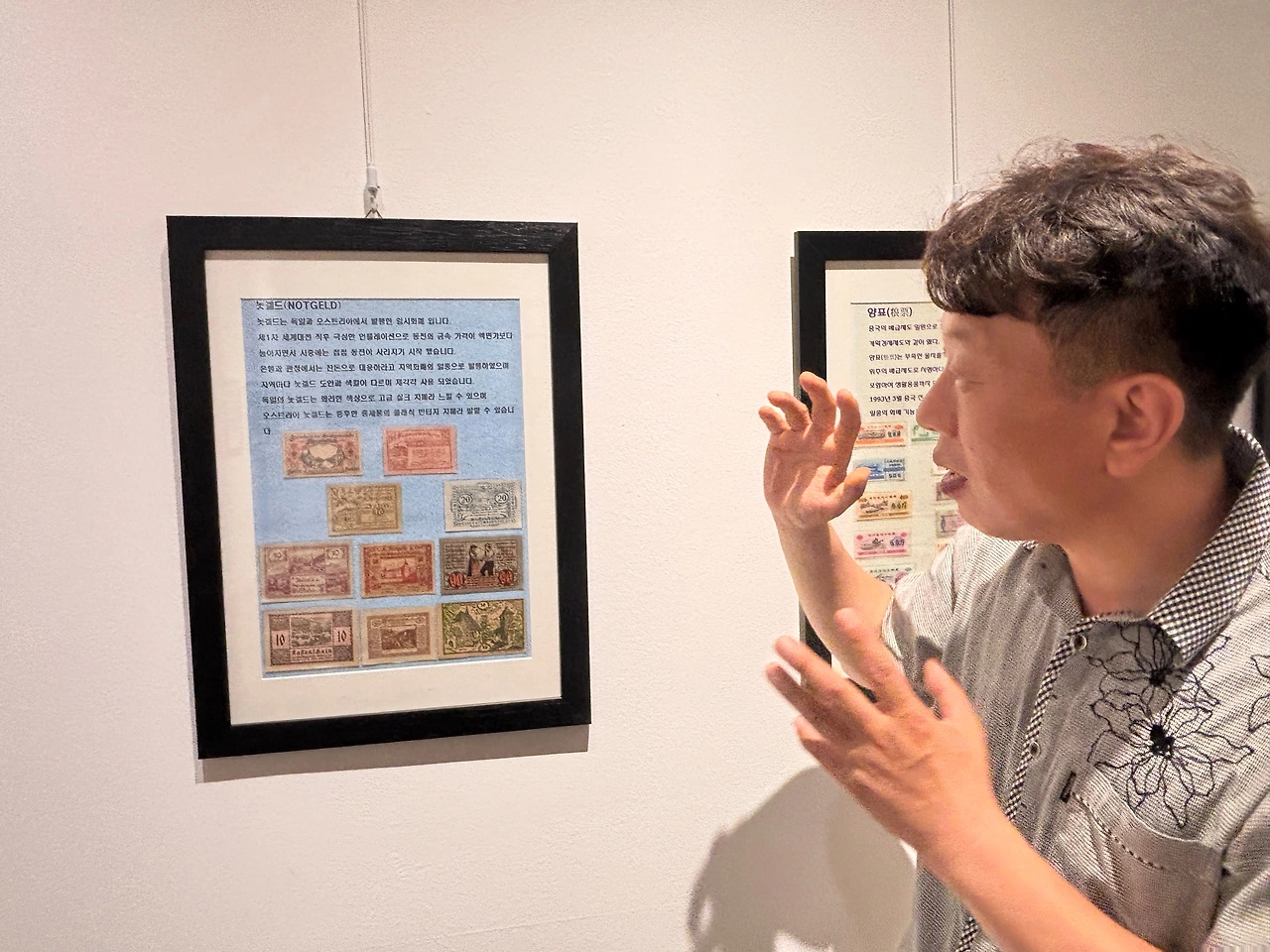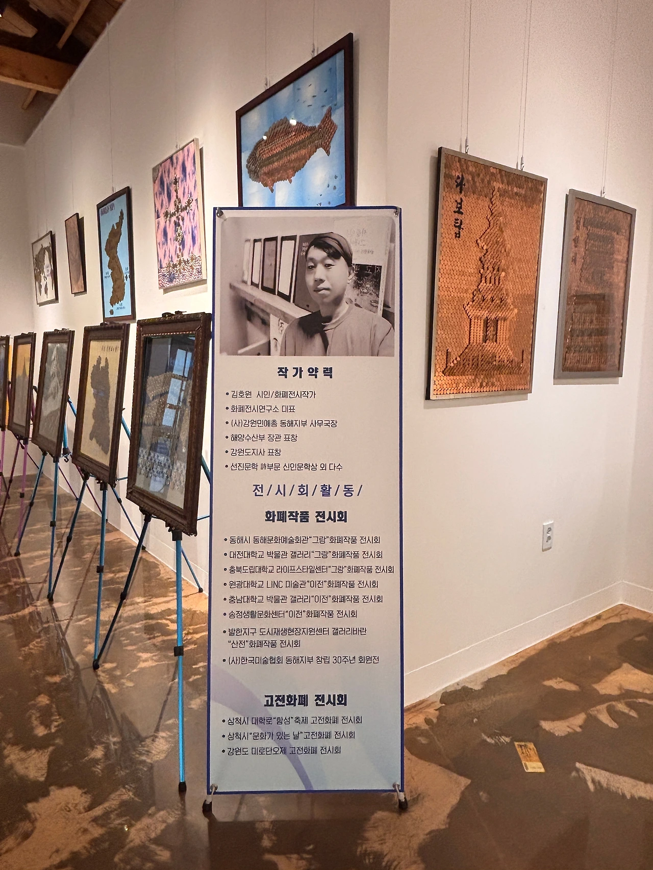 2일, 평소 친절하기로 소문난 시인이 주관하는 화폐작품전시장을 방문했다. 장소는 도시재생으로 근대산업시설을 문화재생한 묵호 갤러리 ‘바란‘이다. 아쉽게도 전시 마지막날이다. 관람객들은 화폐가 사람을 만나 문화가 되는 과정을 온몸으로 실감하게 된다. 김호원 작가가 지난 40년간 수집한 화폐작품전시회다. 이 전시는 동전과 지폐의 물성은 물론 화폐에 깃든 인간 존재의 본질적 물음을 던진다.