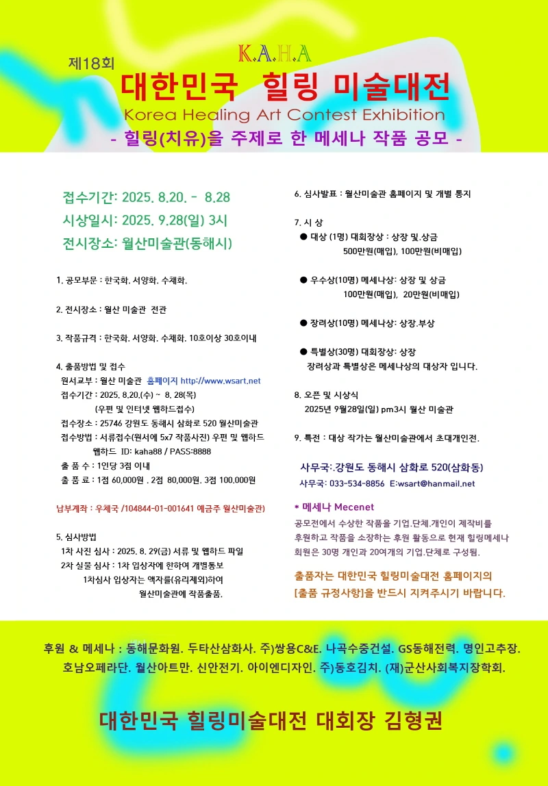 이런 시대적 요구에 응답하듯, 제18회 대한민국 힐링미술대전이 오는 9월 28일, 강원도 동해시 월산미술관에서 시상식과 함께 개막한다. 이번 공모전의 주제는 명확하다. “힐링(치유)을 예술로 말하라.”