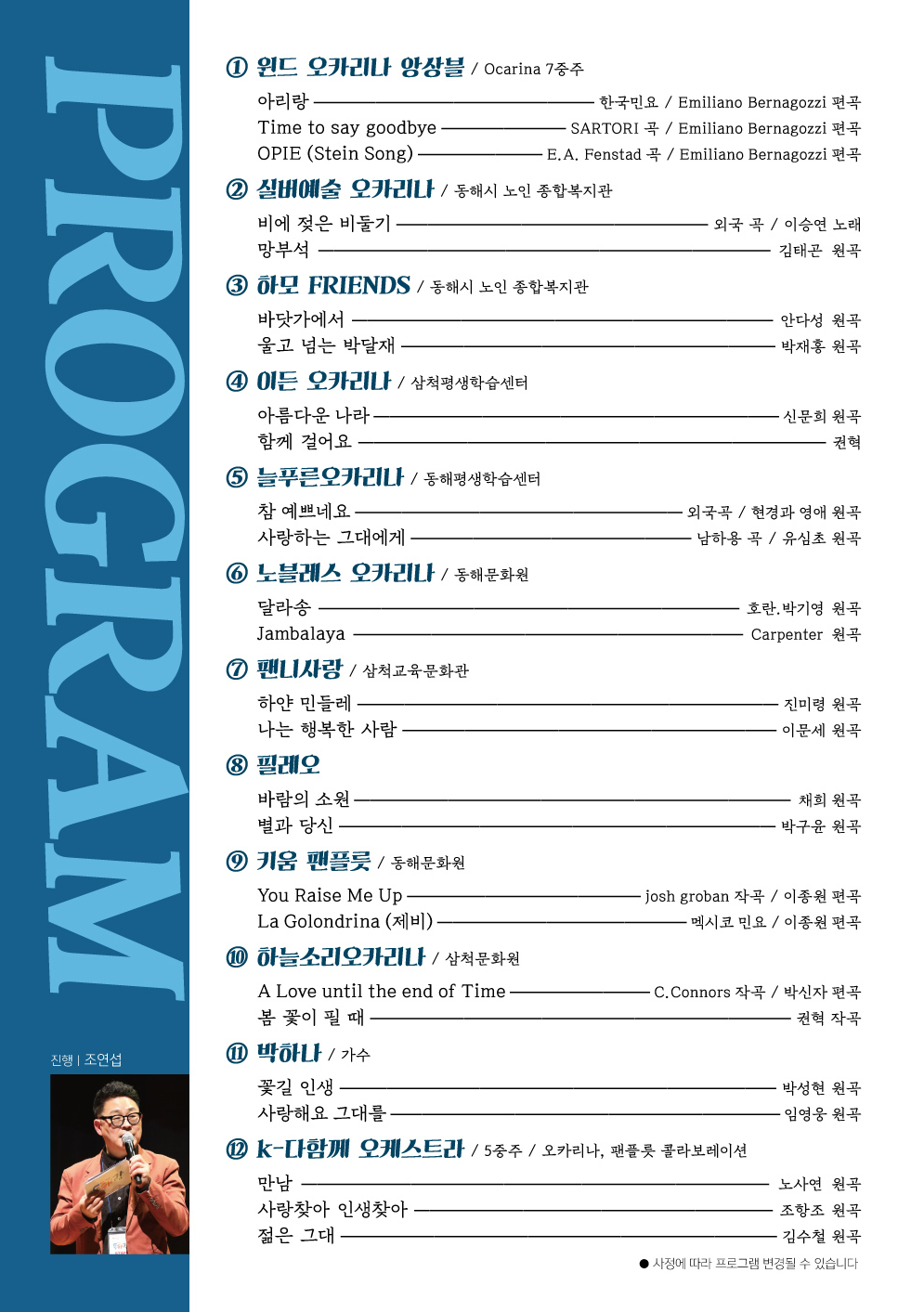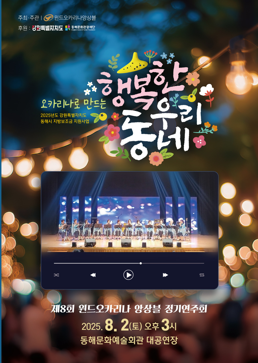 8월 2일, 동해문화예술회관 대공연장에서 오카리나의 아름다운 선율이 동해를 물들이고, 예술이 선사하는 진정한 행복을 함께 나누는 뜻깊은 시간 경험하시길 바랍니다. 이 작은 악기가 만들어낼 커다란 감동과 따뜻한 공동체의 이야기에 동참해 주시길 바랍니다.