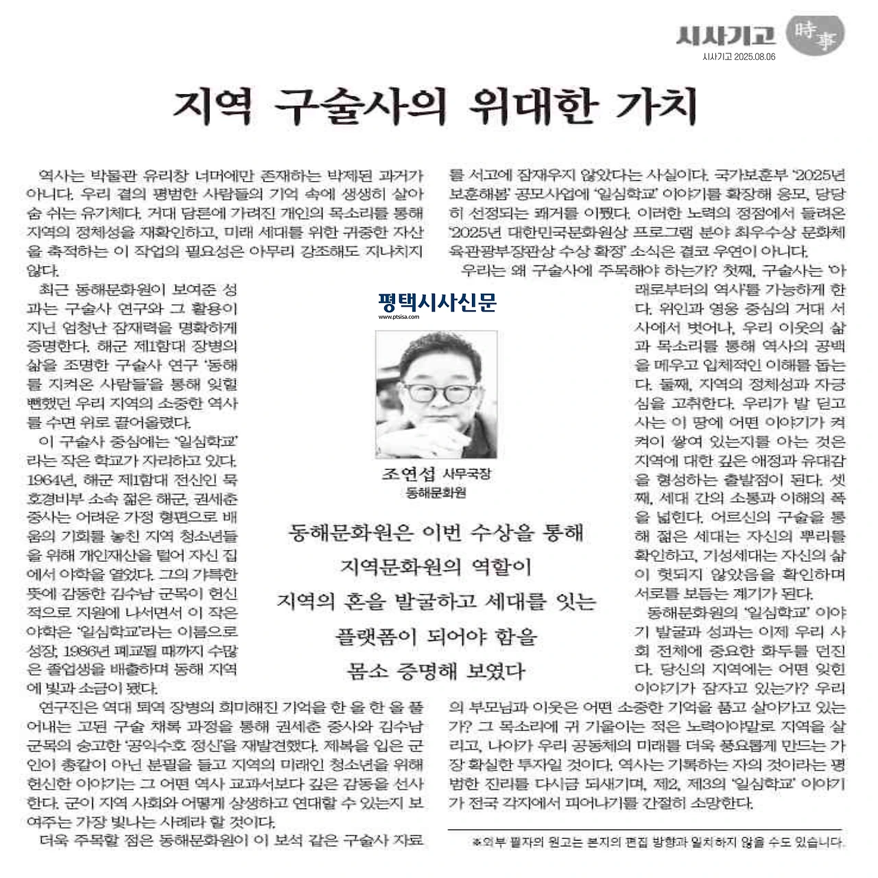 아래 내용은 최근 해군 2함대가 주둔하고 있는 평택의 대표언론 평택시사신문 임봄 문학평론가 요청으로 기고한 필자의 글 “지역 구술사의 위대한 가치” 시사기고 사본이다.